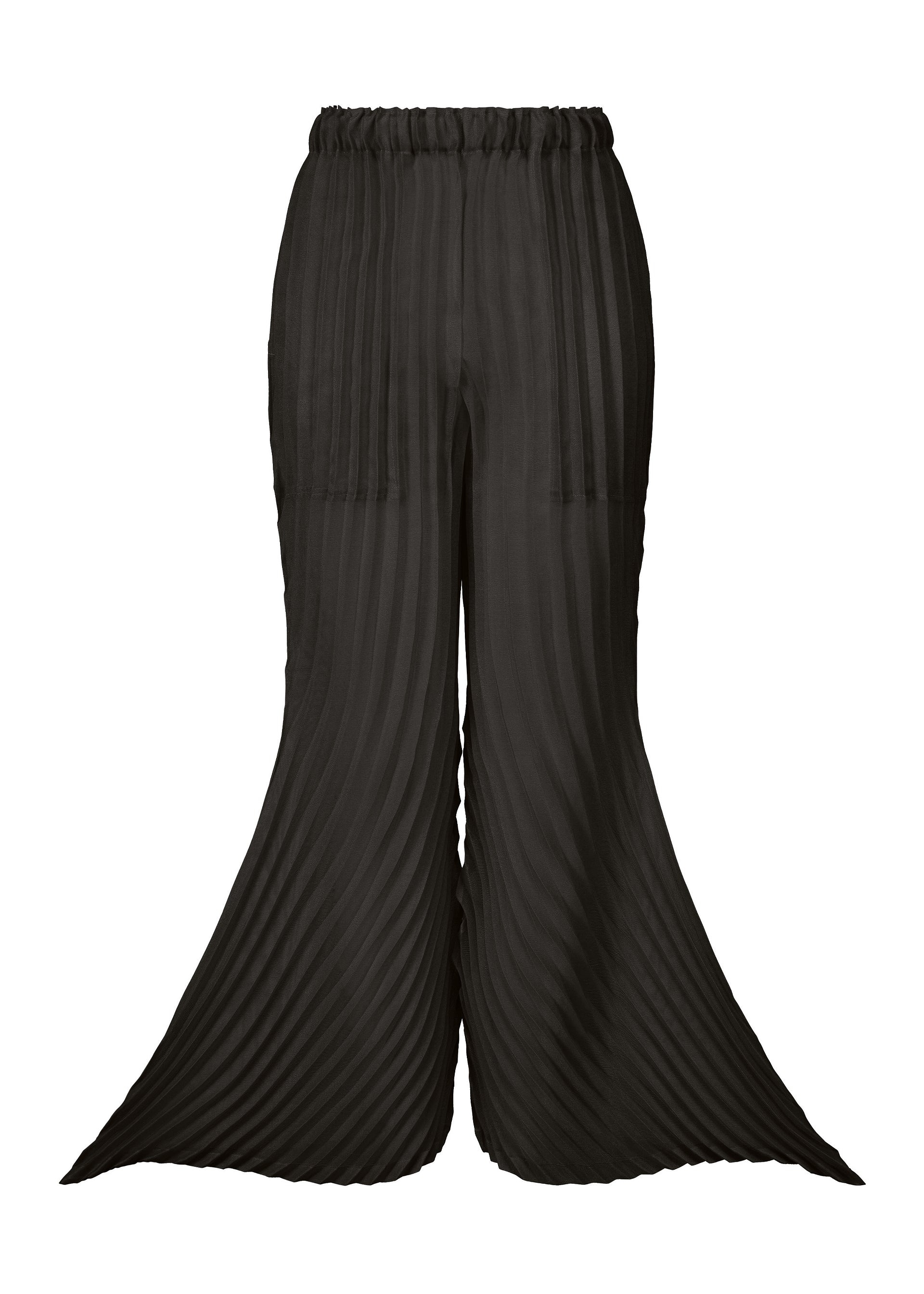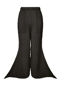 An elegant, sculptural series, WANDER features hand-pleated folds that form three-dimensional, leaf-like designs with a subtle transparency. These pleated pants have a slim fit through the thigh and a dramatic angular flare at the hem. They include two side pockets and an elastic waist.