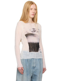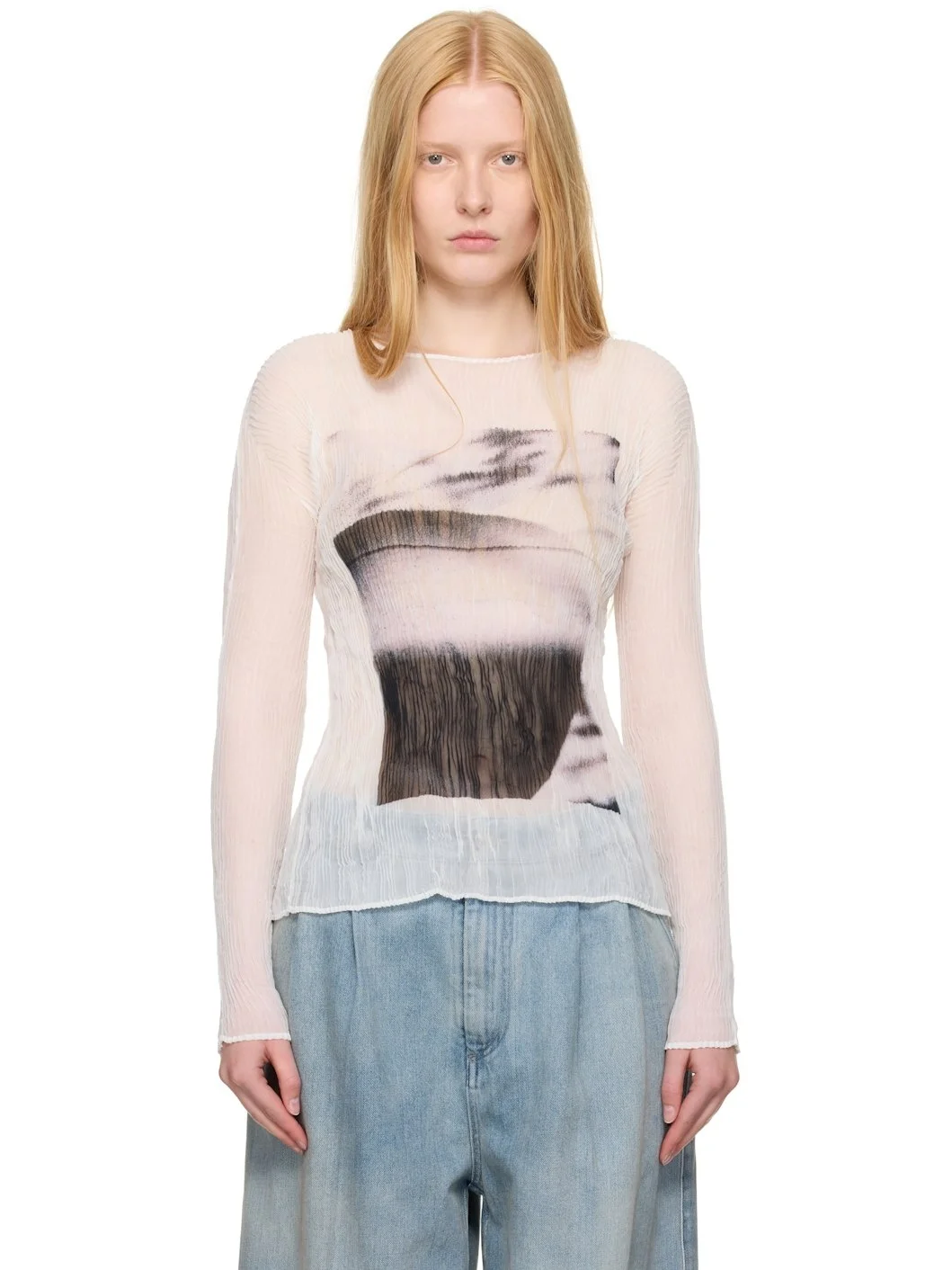 Garment-pleated recycled polyester chiffon shirt. · Semi-sheer · Round neck · Inkjet-printed graphic pattern at front and back Supplier color: Shadow 100% recycled polyester. Made in Japan 252809F096005