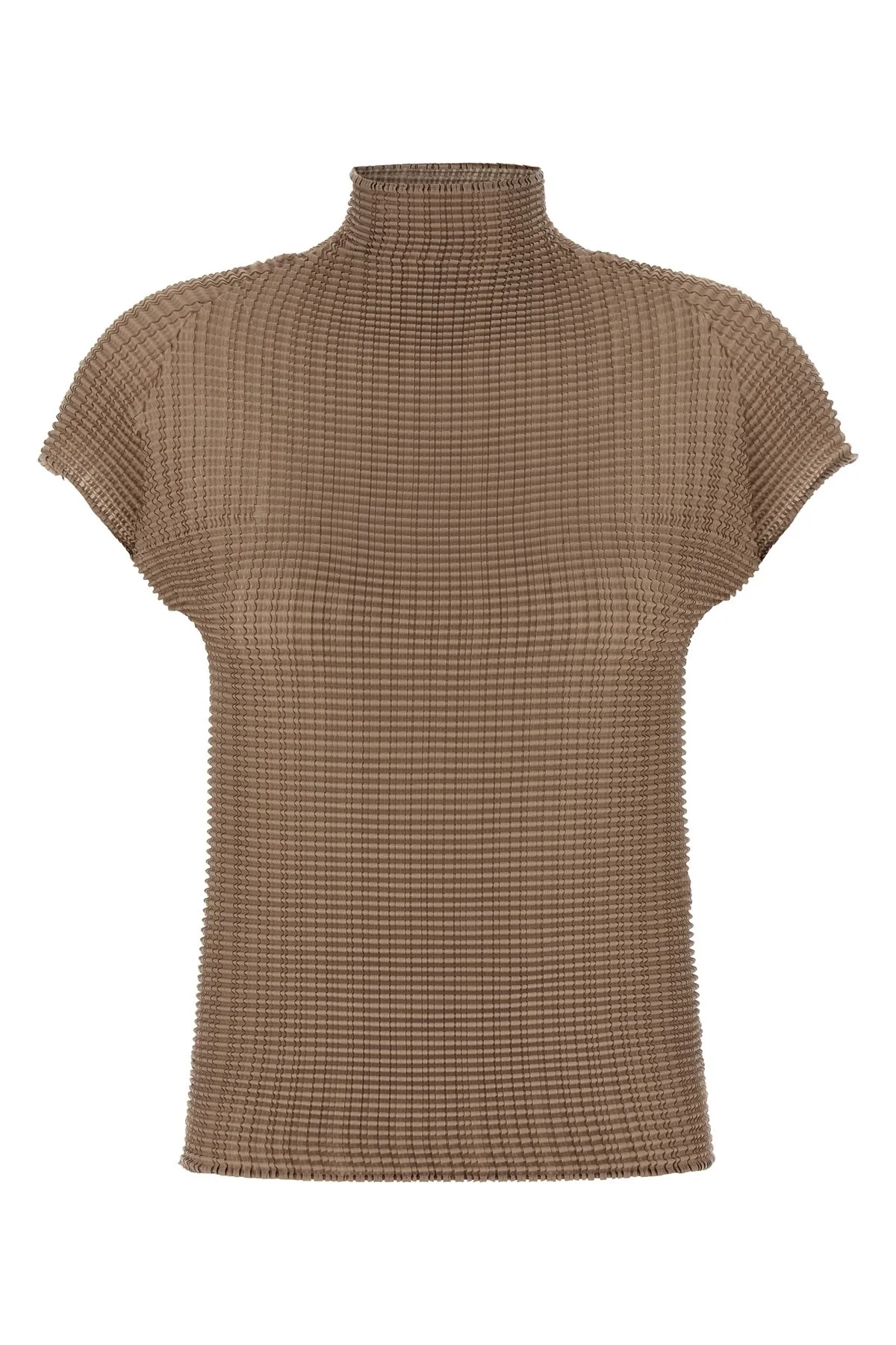 cod. IM66FJ67510 'Wooly Pleats-66' pleated T-shirt with high neck, short sleeves. SUSTAINABLE: Product made from recycled polyester. Color: Beige Size & Fit: true to size fit Composition: 100% polyester Made in: Philippines