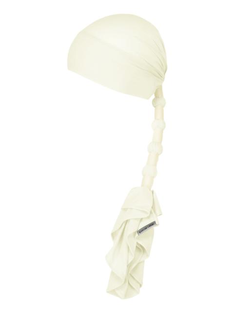 This cap, made from jersey material, has a silhouette that resembles a person with a ponytail when worn. Made from thin jersey material with excellent stretch and recovery, and designed to feel like a second skin, its three-dimensional form is achieved by tying the single-piece pattern with a drawstring. It is characterized by its comfortable fit on the head, natural movement that changes with the wearer, and a silhouette that makes it seem as if their hair were tied back. This item takes a new approach that balances fashion with comfort. Product Information Material: 87% Nylon, 13% Polyurethane; String: 100% Linen. Made In Japan.