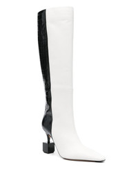 90mm Les Bottes Bisou boots Highlights - White/black - Calf leather - Smooth grain - Embossed crocodile effect - Panelled design - Slip-on style - Pointed toe - Branded leather insole - 90mm high geometric heel - Leather outsole - Knee-length Made in Italy Composition Outer: Calf Leather 100% Lining: Calf Leather 100% Sole: Calf Leather 100% SIZE & FIT Measurement CIRCUMFERENCE 14.96 in(38 cm) HEEL 3.93 in(10 cm)