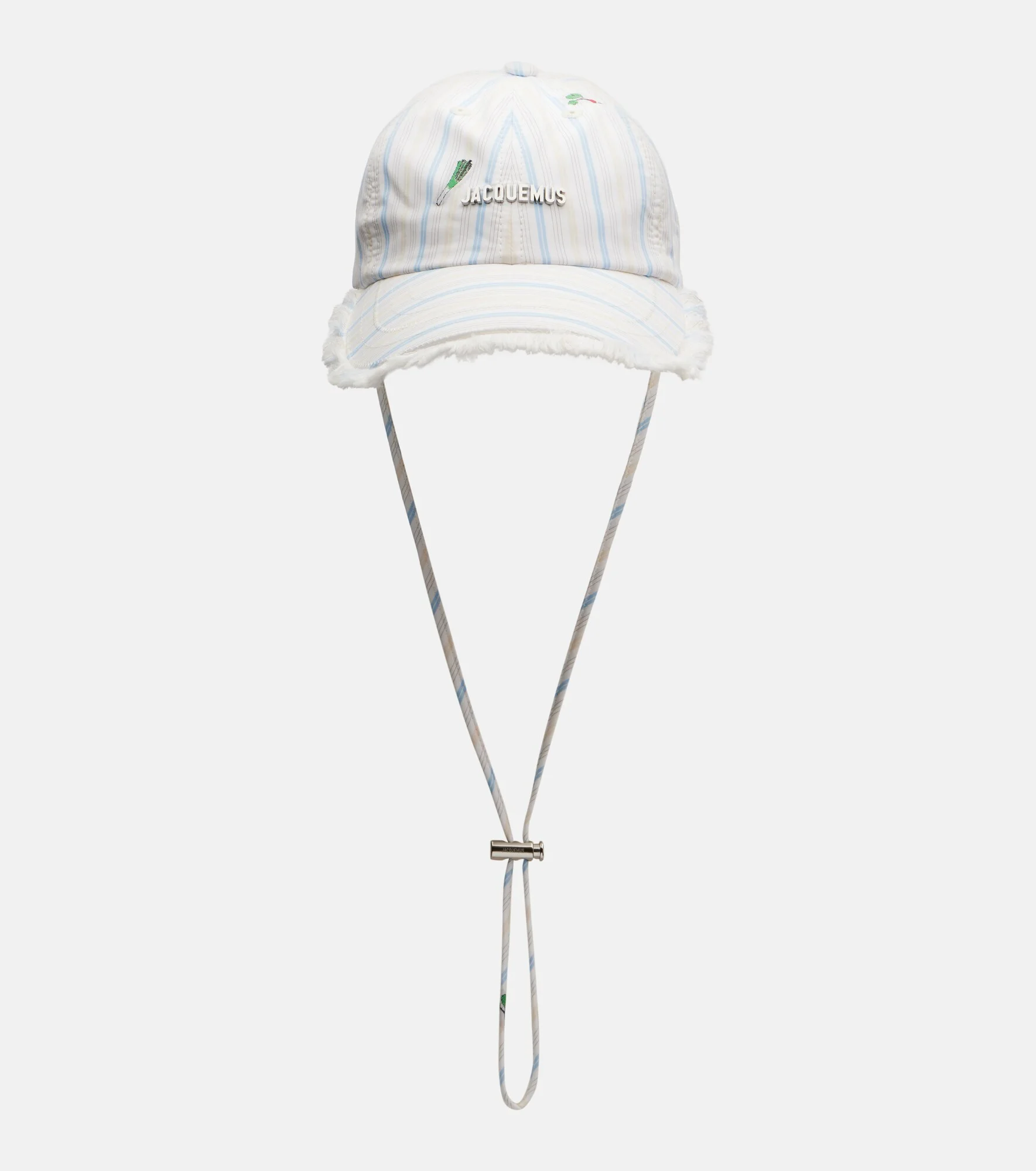 The Artichaut baseball cap from Jacquemus is a spin on a classic. This piece is crafted from cotton canvas in an all-over striped motif with fun jacquard vegetable motifs throughout and is complete with an adjustable strap, signature logo hardware, and frayed edges. Product Details - Material: 100% cotton - Care instructions: hand wash - Made in Bulgaria - Color: white - Designer color name: Jacquard Classic Stripes - Closure: drawstring - Item number: P01139917