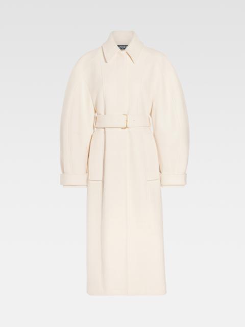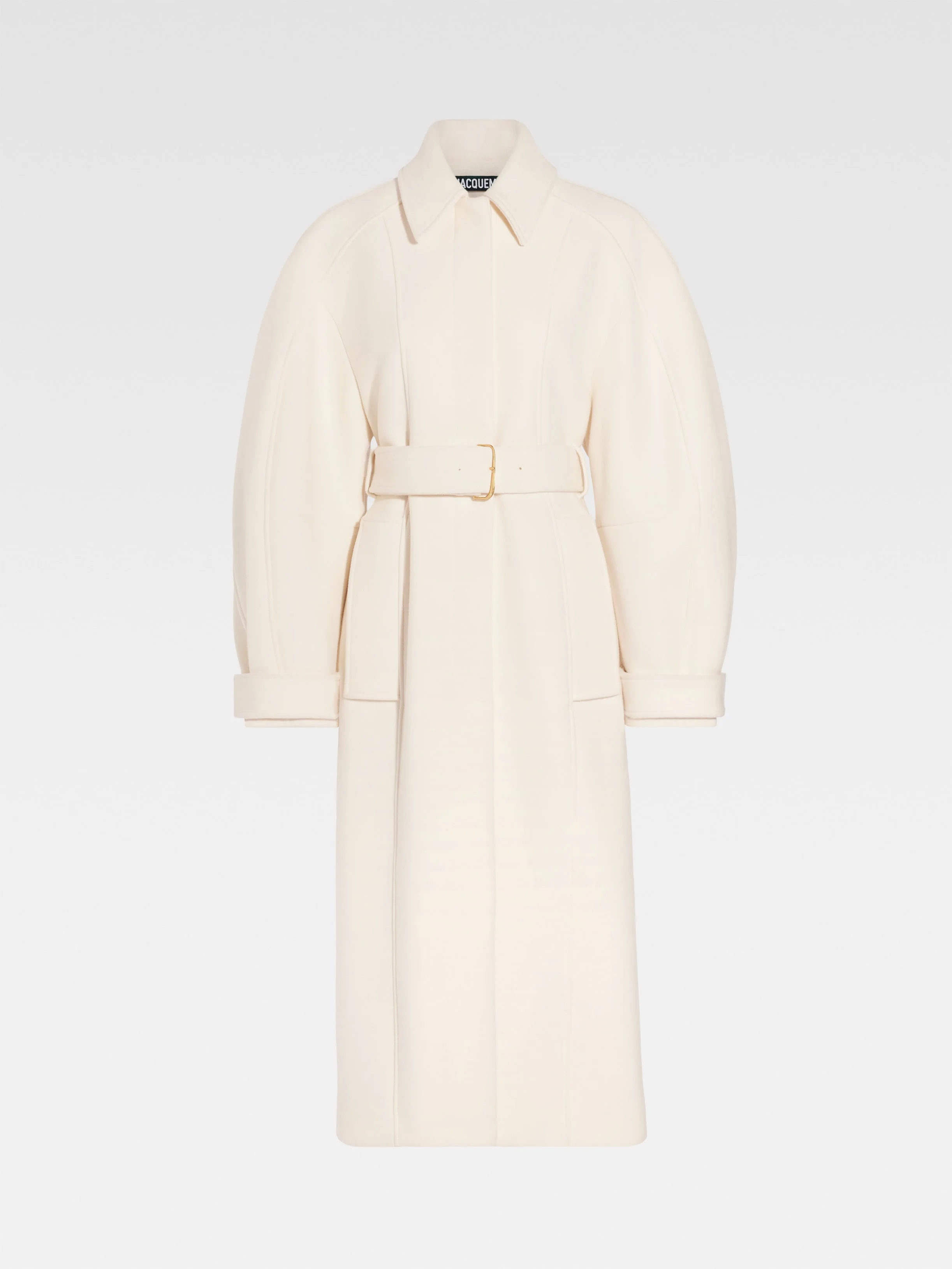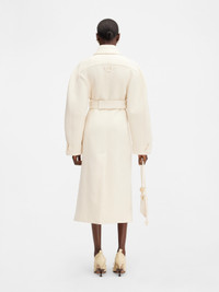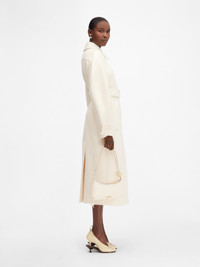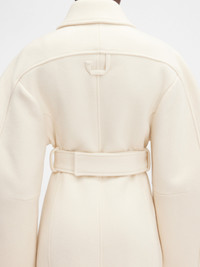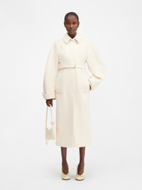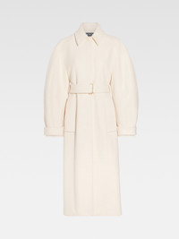 LA CASA Raglan-sleeve coat - Mid-calf length - Round fit with fitted waist - Winter wool twill - Pointed collar - Piped seams - Round raglan sleeves - Hidden snap-button placket - Removable belt with metal buckle - Belt loops - Straight fit from the waist - Oversized welt pockets - Snap-button sleeve tabs - Back yoke with “J” locker loop - High back-slit - Gold metal hardware - Fully lined The model is 180cm and wears a size 34 100% Virgin wool Made in Bulgaria Ref. 243CO068-1614-110