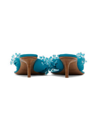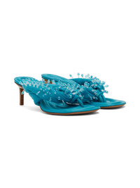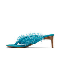 Grained leather heeled sandals in blue. · Open toe · Thong-style strap · Beaded and twisted accent at vamp · Molded footbed · Buffed leather outsole in tan · Rubber injection at stacked heel · Heel: H2.5 in Supplier color: Turquoise Leather. Made in Italy 221553F125012