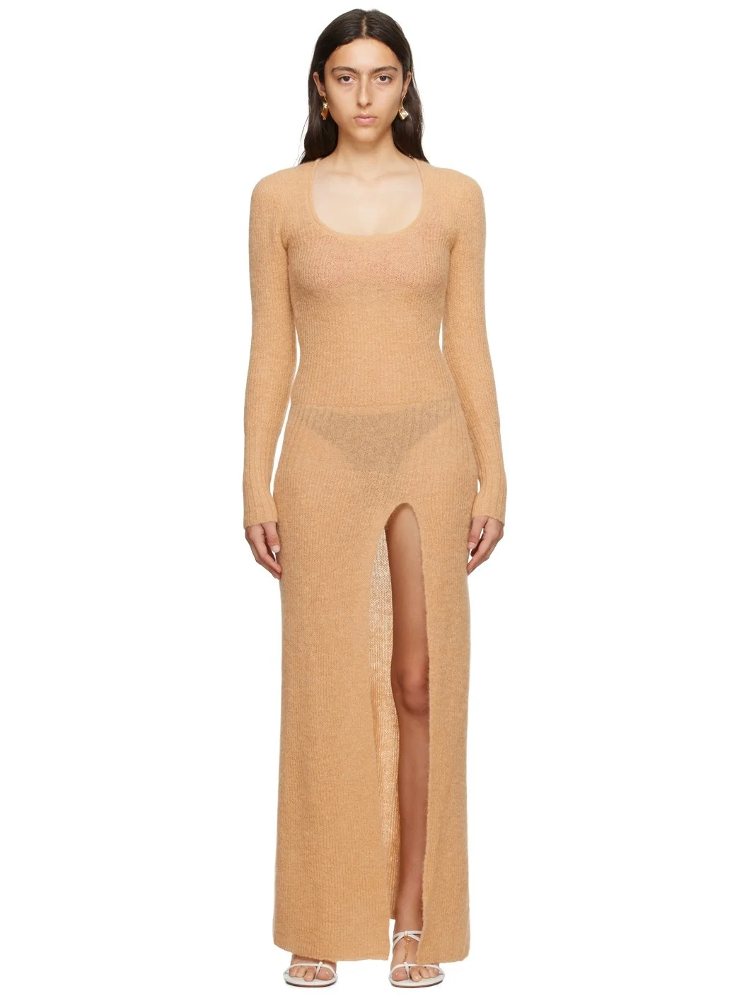 Brushed rib knit mohair- and alpaca-blend dress. · Rib knit scoop neck · Slit at front hem Part of the Le Chouchou collection. Supplier color: Dark beige