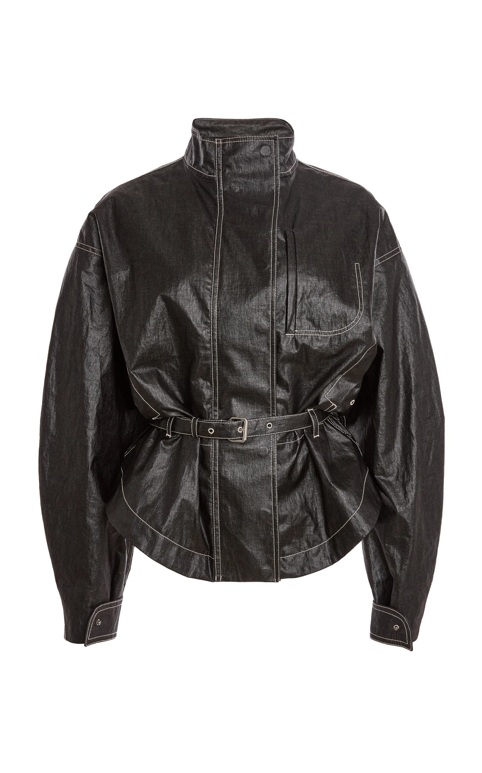 With this deeply personal collection just sown at Versailles, Simon Porte Jacquemus tells the story of his upbringing in Provence. A melange of abundant pleats, sweeping tiered skirts, and lucid sheers pair with highly covetable accessories for an effect that’s both fantastical and pristine. PRODUCT DETAILS - Relaxed fit, high neck, contrast stitching, belt detailing - Concealed snap fastenings and buckle - Lined - Composition: 52% viscose 48% cotton 100% linen - Color: black - Dry clean - Spring/Summer '26 SIZE & FIT - Our model is wearing a size FR 34 - Model is 5'11" with a 31.5" bust, 23" waist, and 34.5" hip