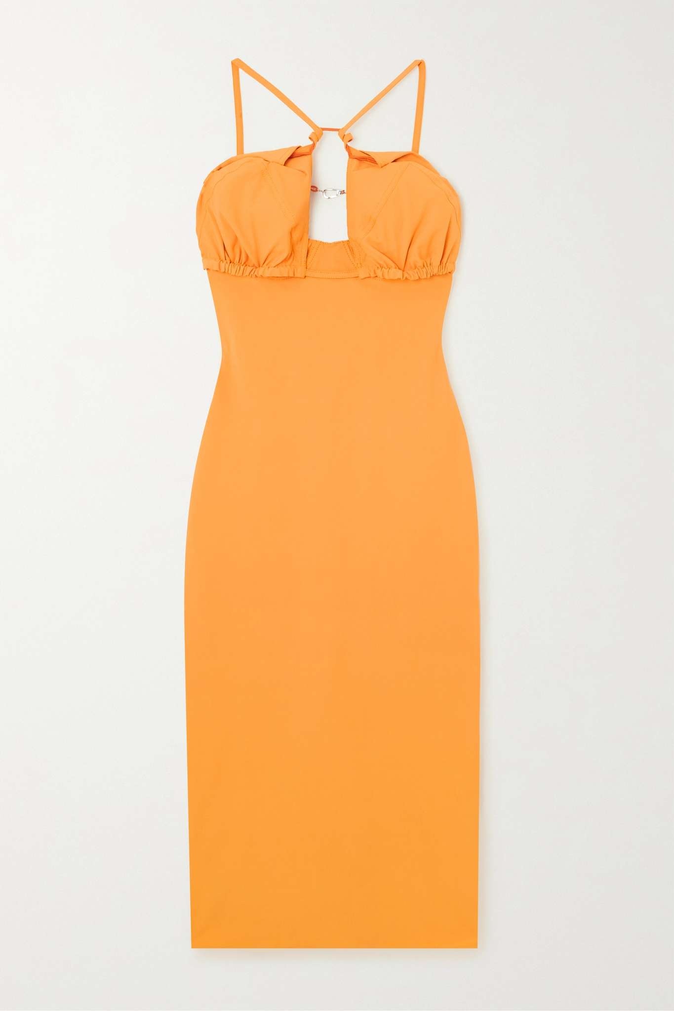 EDITORS'NOTES Jacquemus' 'Bikini' midi dress will have you dreaming of balmy vacation days. Made from orange stretch-twill, it has a ruffled halterneck overlay inspired by beachwear and curve-enhancing seams through the pencil skirt. Wear yours with a tonal bag and sandals. SIZE & FIT - Fits true to size, take your normal size - Designed for a slim fit - Mid-weight, non-stretchy fabric - Model is 177cm/ 5'10" and is wearing a FR 36 DETAILS & CARE - Orange stretch-twill - Concealed hook and zip fastening at back - 55% polyamide, 36% cotton, 9% elastane - Dry clean