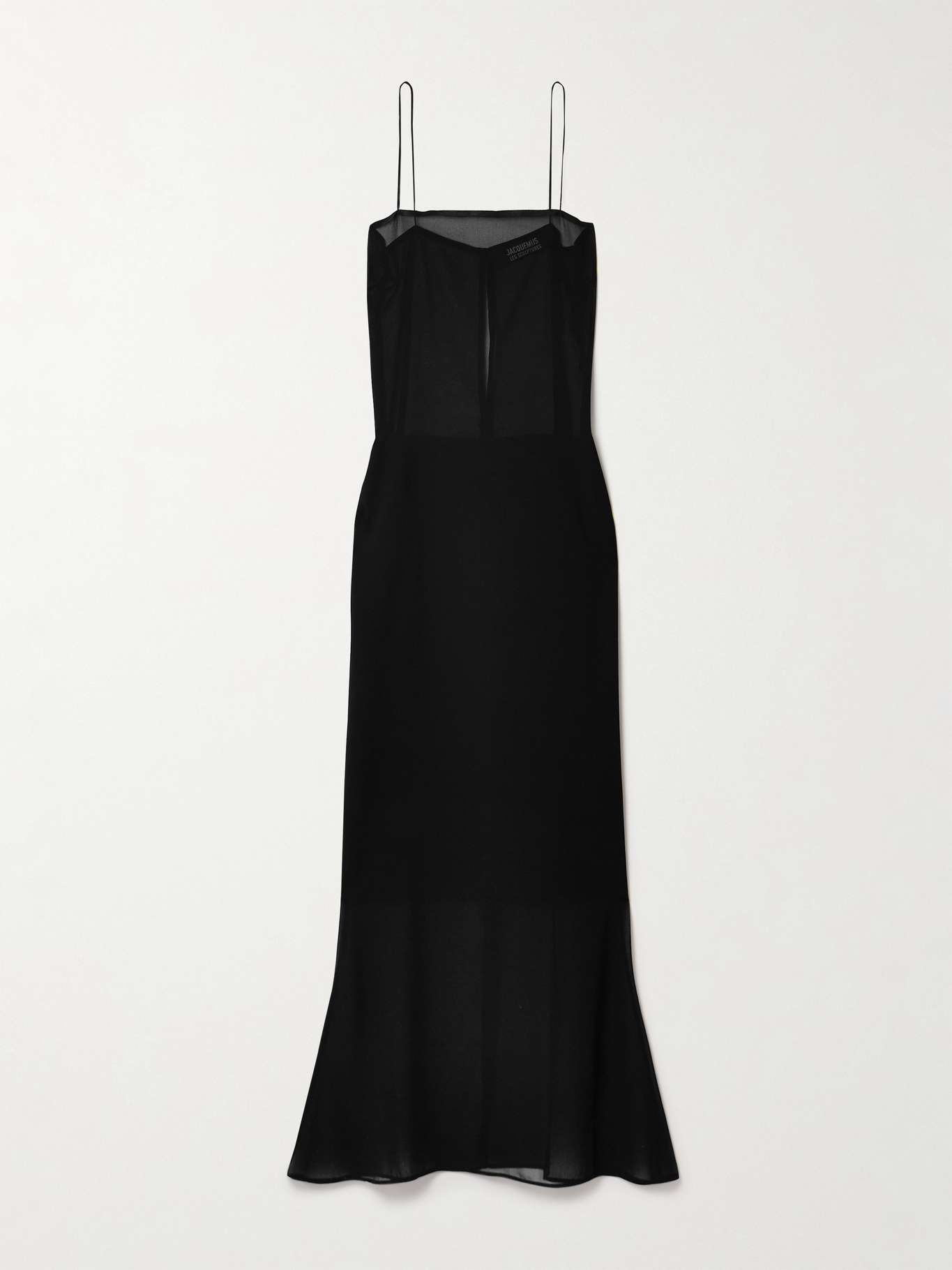 EDITORS'NOTES Jacquemus' 'Brezza' gown is alluring and elegant. Designed in a figure-skimming column silhouette, it's made from semi-sheer crepe that's partially lined through the skirt for coverage and has a floor-sweeping hem complete with a back split, so you can move with ease. Underpin yours with a bralette. SIZE & FIT - Fits true to size, take your normal size - Those with a curvy figure may wish to take the next size up - Designed for a slim fit - Slightly long in length - Lightweight, non-stretchy fabric - Model is 177cm/ 5'10" and is wearing a FR 36 DETAILS & CARE - Black crepe - Button fastenings along back - 100% polyester - Dry clean