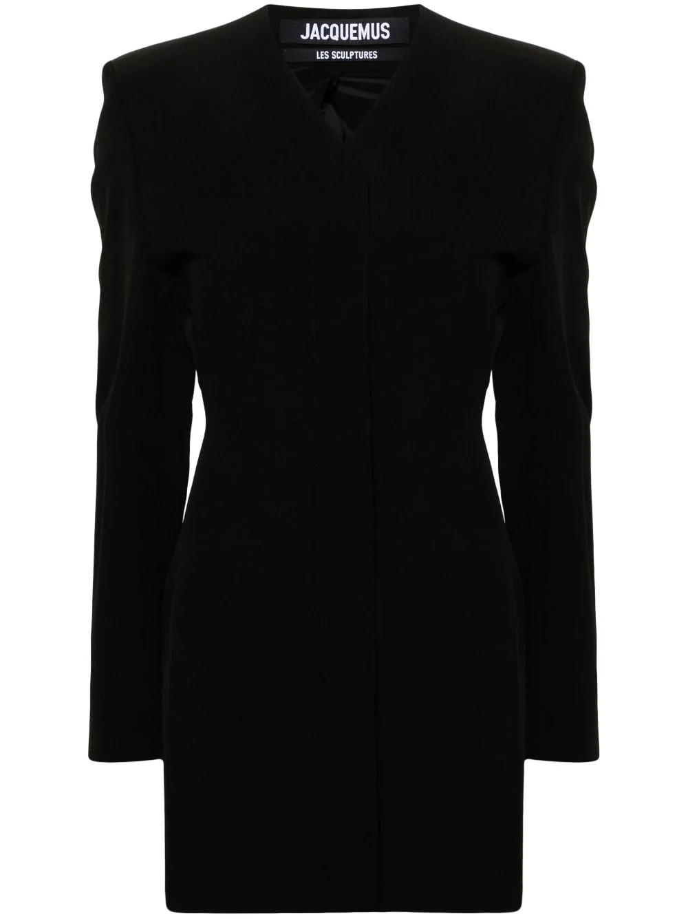 La Robe Cubo blazer minidress Jacquemus' La Robe Cubo blazer minidress is cut to a V-neck silhouette and is enhanced with shoulder pads. Highlights - Black - Crepe texture - V-neck - Front press-stud and zip fastening - Shoulder pads - Long sleeves - Split cuffs - Slim cut - Straight hem - Thigh-length - Full lining Imported Composition Outer: Viscose 88%, Polyamide 12% Lining: Viscose 100% SIZE & FIT Model measurements Height 5 ft 10 in(1.77 m) Bust/Chest 33.07 in(84 cm) Hips 37 in(94 cm) Waist 24.8 in(63 cm) FittingInformation Designed for a slim fit that sits just away from the body offering a close yet comfortable fit The internal shoulder pads offer a structured shape Made from a midweight non-stretch fabric This piece fits true to size – take your usual size