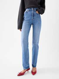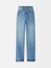 Straight leg jeans - High-rise - Washed indigo denim - “J” belt loop - Engraved metal button fly - Five pockets including ticket pocket - Long straight leg - Embroidered patch on the back - Partial back yoke - Back patch pockets with laser-printed logo - Horizontal seam on the back of the knee 100% Cotton / Lining: 65% Polyester - 35% Cotton Made in Portugal Ref. PAW00028AD0003833C