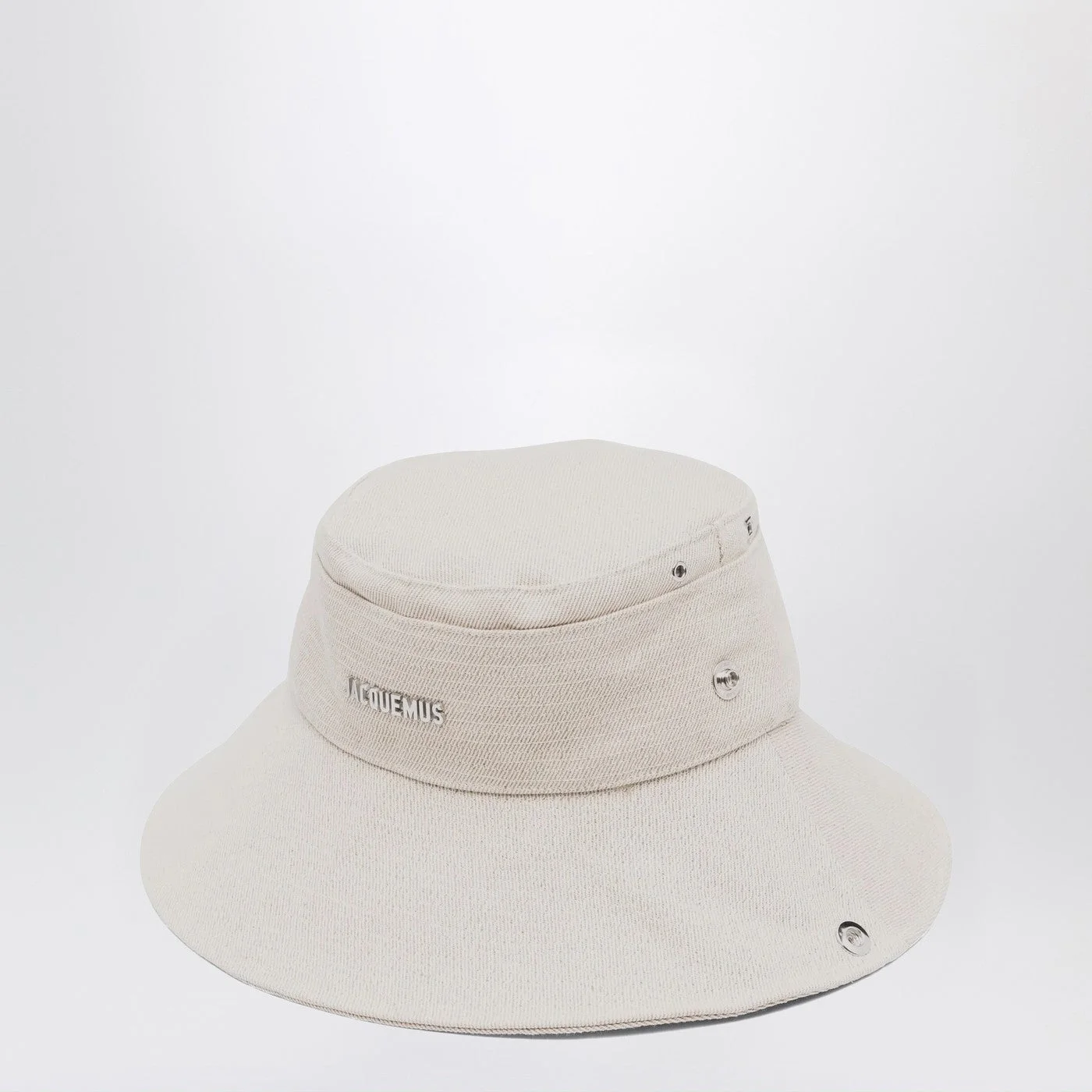 Bucket hat by Jacquemus in white canvas• Long adjustable strap• Topstitched brim• Side snap buttons• Circular and square ventilation eyelets• Circular drawstring• Square detail on the back• Silver-tone metal logo