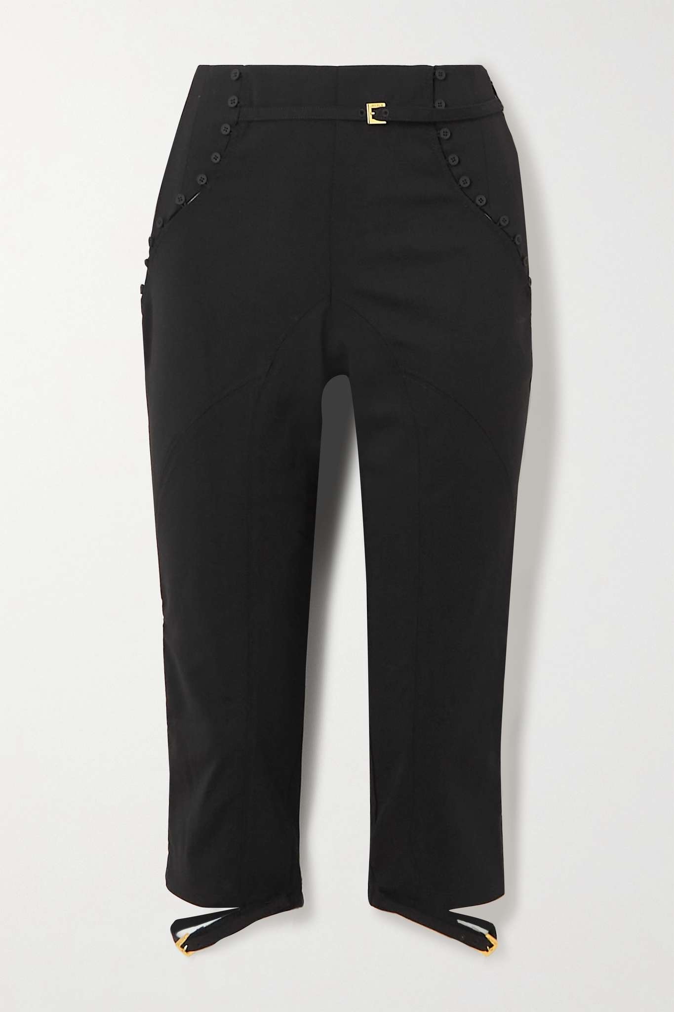 EDITORS'NOTES Leave it to Jacquemus to make classic capri pants even sexier. This 'Caraco' pair is cut for a slim fit from wool-blend and has lingerie-inspired straps. Match your jewelry to the gold-tone hardware. SIZE & FIT - Fits true to size, take your normal size - High-rise, intended for a skinny fit - Cropped length - Mid-weight, slightly stretchy fabric - Model is 177cm/ 5'10" and is wearing a FR 36 DETAILS & CARE - Black wool-blend - Concealed hook and zip fastening along side - 98% wool, 2% elastane - Dry clean