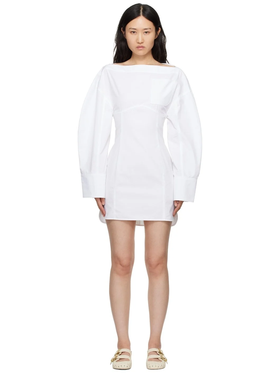Cotton poplin dress. · Layered construction · Boat neck · Patch pocket · Vented side seams · Balloon sleeves · Single-button barrel cuffs · Cutout and post-stud tab at back · Zip closure at back · Mother-of-pearl hardware Part of the La Casa collection. Supplier color: White 100% cotton. Made in Bulgaria 242553F052017