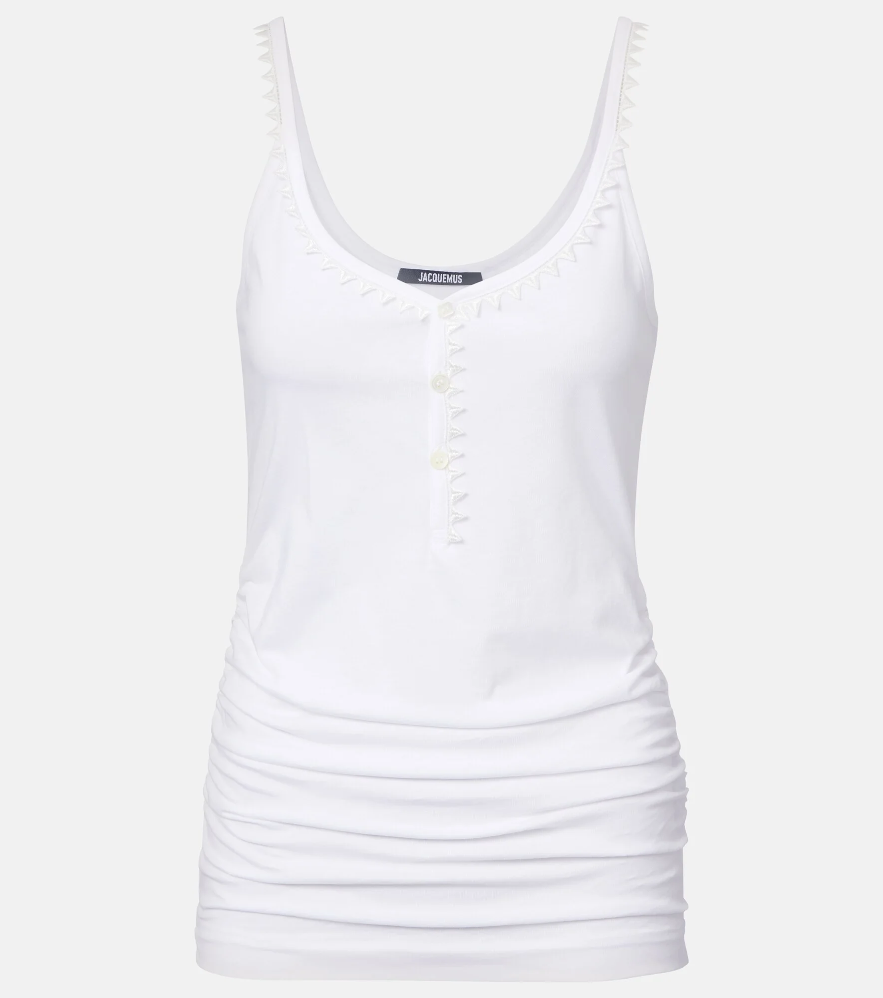 Jacquemus brings a characterful vision of French fashion to the design of every new collection. Crafted from soft cotton, the Clavela top features a comfortable silhouette with soft draping at the hips and is detailed with spike-embroidered trims. Product Details - Material: 100% cotton - Care instructions: hand wash - Made in Portugal - Color: white - Designer color name: White - Closure: partially buttoned front - Item number: P01126360 Size & Fit - True to size - Cinched waist - Slightly stretchy fabric - Falls below the hip - The model seen in the picture is 178cm-5'10" and wearing a size XS