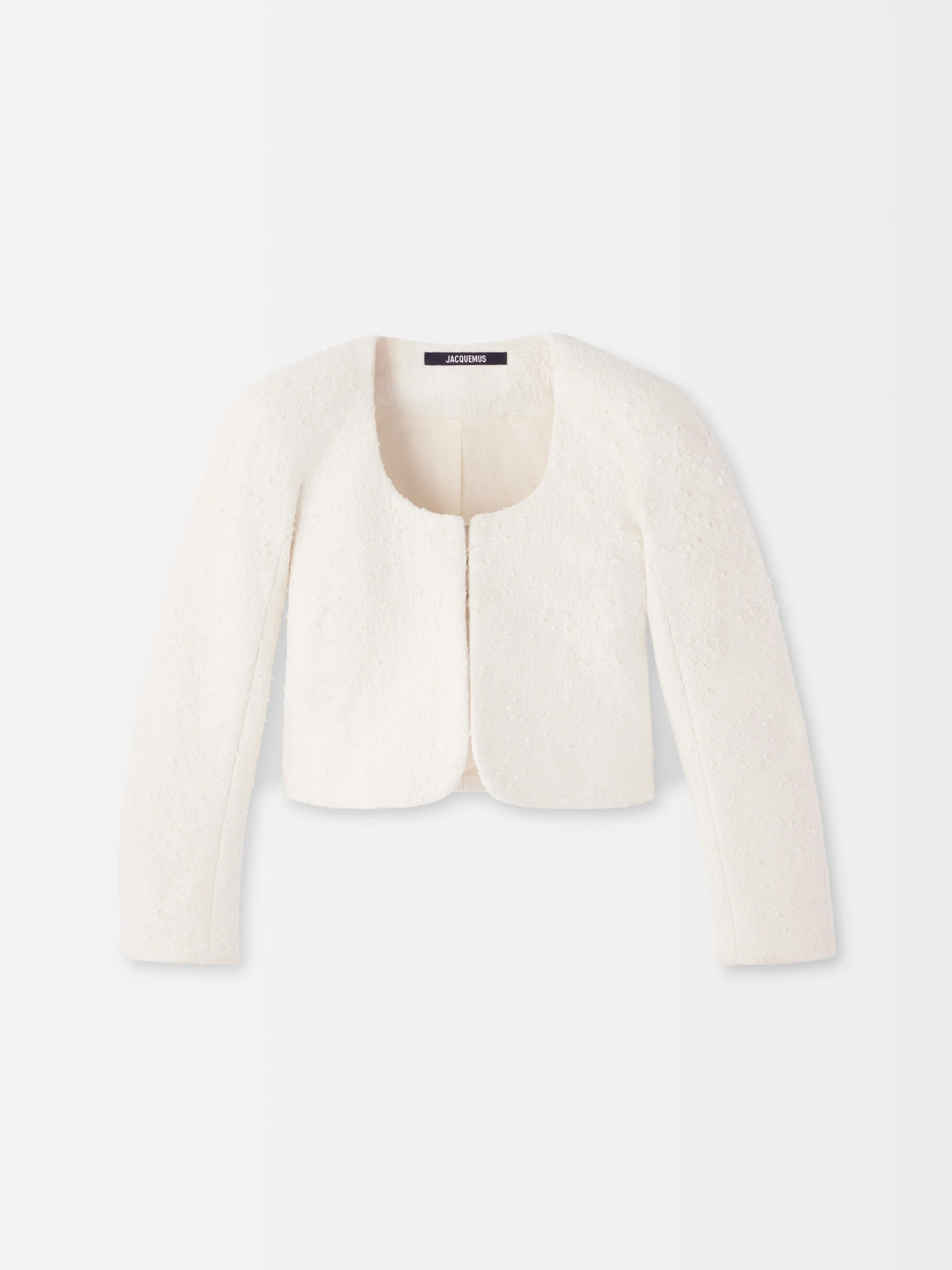 Cardigan jacket - Cropped straight fit - Lightweight tweed - Round open neckline - Cropped rounded sleeves - Hook-and-eye closure - Fully lined The model is 177cm and wears a size 34 65% Polyester - 18% Acrylic - 10% Polyamide - 7% Silk / Lining: 52% Viscose - 48% Cotton Made in France Ref. JAW00118AW006361KD