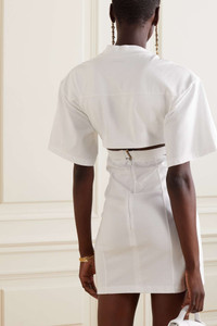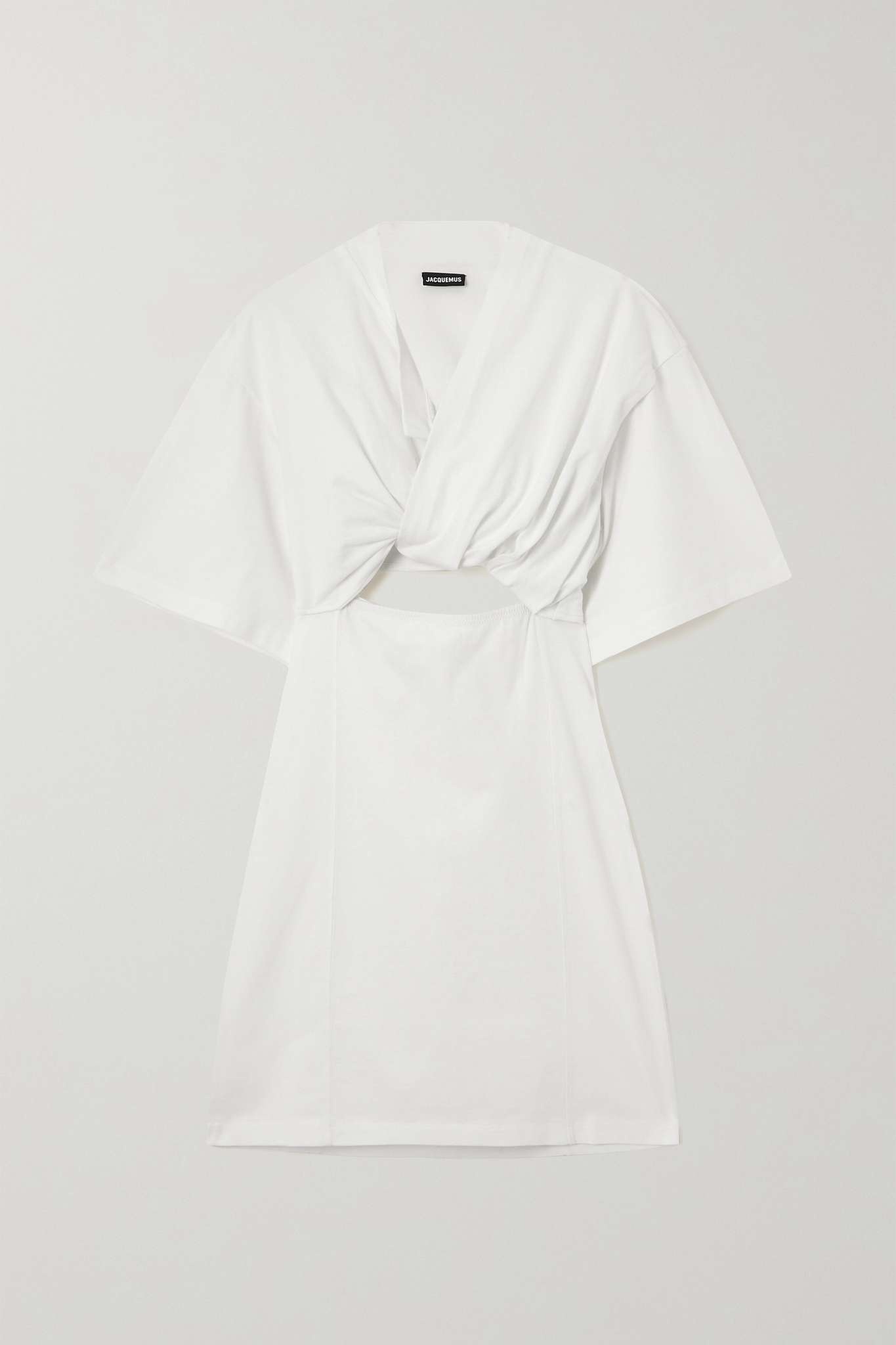 EDITORS'NOTES Jacquemus' mini dress is the same white hue as the row boats at the brand's Château de Versailles show, which lucky guests watched on from. Riffing off of a sexily twisted T-shirt, this 'Bahia' style is made from cotton and has the designer's signature lingerie-inspired strap at the back. SIZE & FIT - Fits true to size, however those who are between sizes should take the smaller size - Designed for a slim fit with oversized sleeves - Lightweight, stretchy fabric - Model is 177cm/ 5'10" and is wearing a size XS DETAILS & CARE - White cotton - Hook and concealed zip fastening at back - 100% cotton - Dry clean