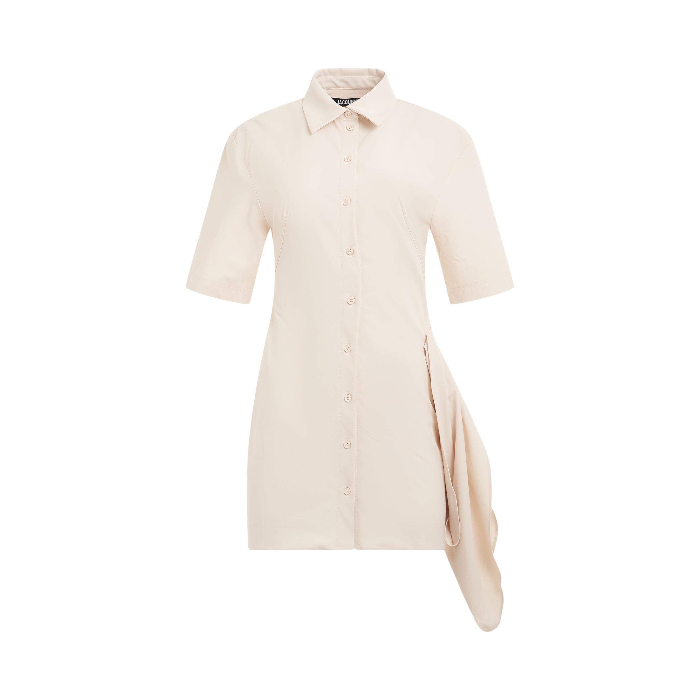 The La Robe Camisa shirt dress by Jacquemus is a unique take on the classic shirt dress. The dress features an asymmetric, ruched overlay at the waist, which creates a wrap-like silhouette and adds a touch of modernity to the design. The dress is made from twill fabric, which gives it a structured and polished look. The dress also features a point collar and a locker loop, which are classic elements that give it a timeless appeal. The combination of classic and modern elements makes this dress a versatile piece. • Composition: Polyamide 55%, Cotton 36%, Spandex/Elastane 9% • Short sleeves • Point collar • Locker loop nod • Wrap-like silhouette SKU: 231DR0531084 120