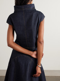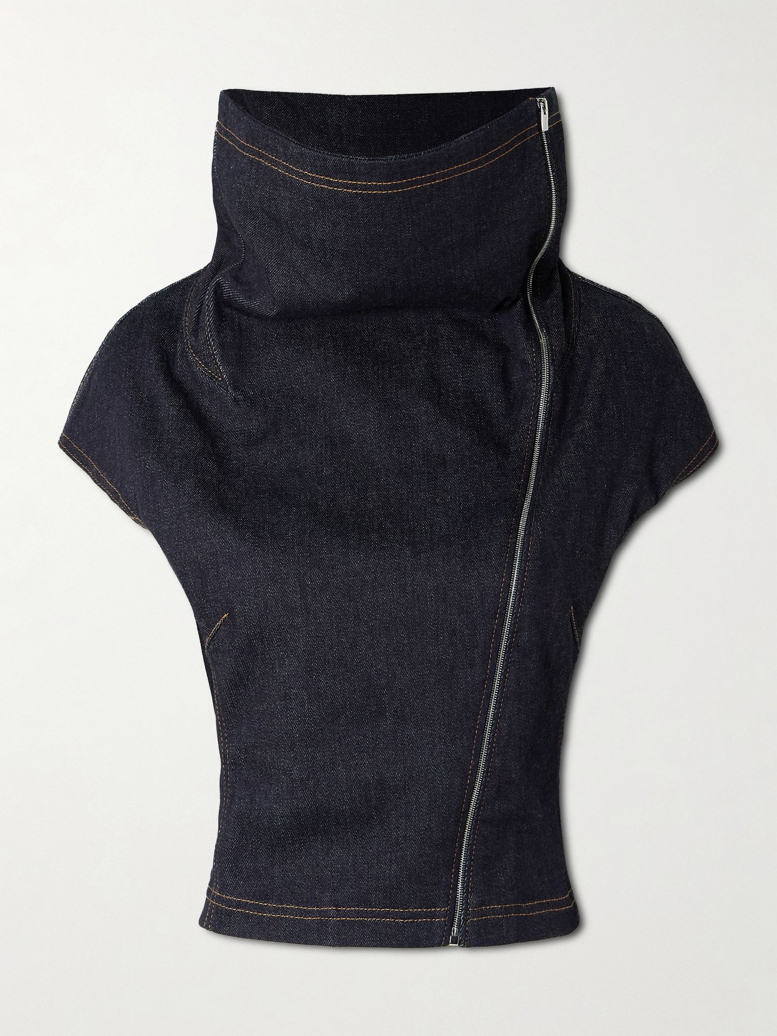 Jacquemus' 'Pasante de-Nimes' top is so striking with its sculptural turtleneck. It's cut from denim and fitted with an adjustable asymmetrical zip so you can alter its shape to your desired look. The waist is embroidered with a cursive 'J' to complement the topstitching. Size & Fit - Fits true to size, take your normal size - Cut for a slim fit - Mid-weight, slightly stretchy fabric - Model is 177cm/ 5'10" and is wearing a FR 36 Model measurements: - Bust: 77cm/ 30.5" - Waist: 62cm/ 24.5" - Hip: 88cm/ 34.5" Details & Care - Dark-blue denim - Zip fastening through front - 93% cotton, 6% cashmere, 1% elastane - Dry clean