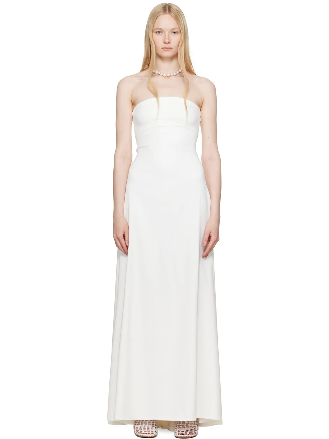 Stretch viscose twill maxi dress. · Straight neck · Dart at chest · Flared hem · Concealed zip closure at side seam · Draping at back · Boning at corset-style stretch jersey underlay Part of the La Croisiere collection. Supplier color: White Body: 96% viscose, 4% elastane. Lining: 80% polyamide, 20% elastane. Made in Bulgaria 251553F055018