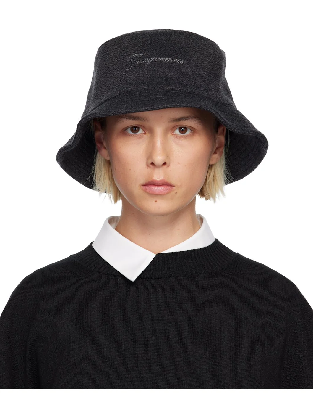 Virgin wool melton bucket hat. · Logo embroidered at face · Quilted brim · Cotton poplin lining Supplier color: Dark grey Body: 100% virgin wool. Lining: 100% cotton. Made in Bulgaria 252553F015010