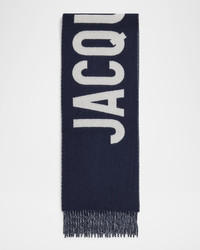 Jacquemus wool fringe scarf featuring a bold jacquard logo. Approx. 14"W x 71"L Fringing at ends May be styled multiple ways Virgin wool Made in Italy