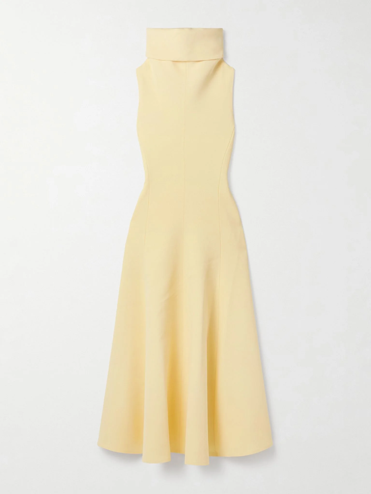 Jacquemus elevates this dress with a dramatic draped neckline — an inventive play on proportions that still exudes elegance. Made from crepe, it has a slim fit with contouring seams and a slightly floaty hem. Size & Fit - Fits true to size, take your normal size - Those with a large bust may wish to take the next size up - Intended to be fitted at the bust and waist, loose at the hip - Mid-weight, non-stretchy fabric - Model is 175cm/ 5'9" and is wearing a FR 36 Details & Care - Pastel-yellow crepe - Concealed hook and zip fastening at side - 70% polyester, 30% viscose - Dry clean