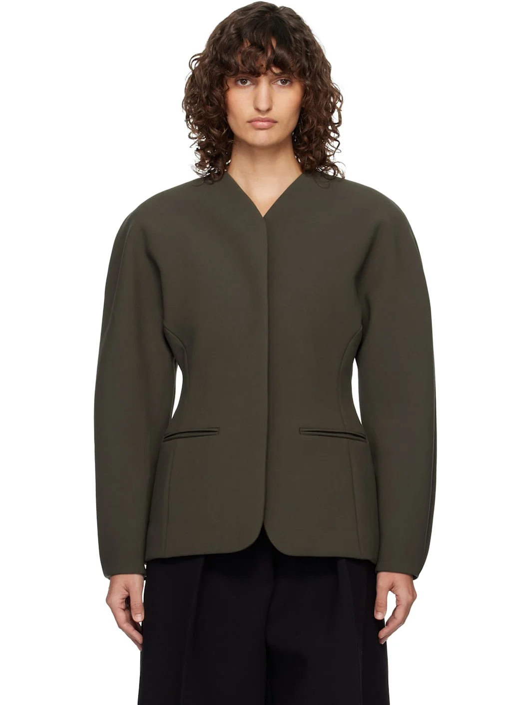 Stretch viscose-blend twill blazer. · V-neck · Concealed button closure · Welt pockets at front · Central vent at back hem · Full twill lining Supplier color: Dark khaki Body: 62% polyester, 33% viscose, 5% elastane. Lining: 48% cotton, 47% acetate, 5% elastane. Made in Bulgaria 261553F057003