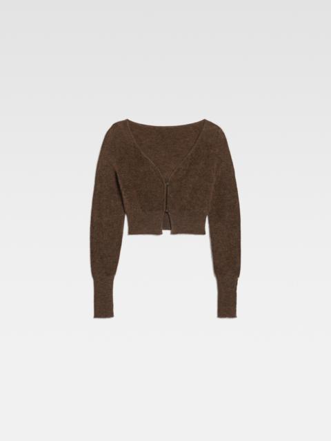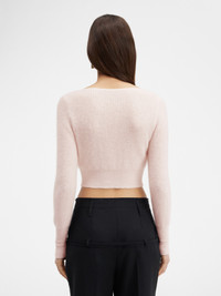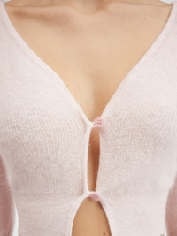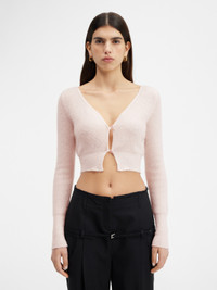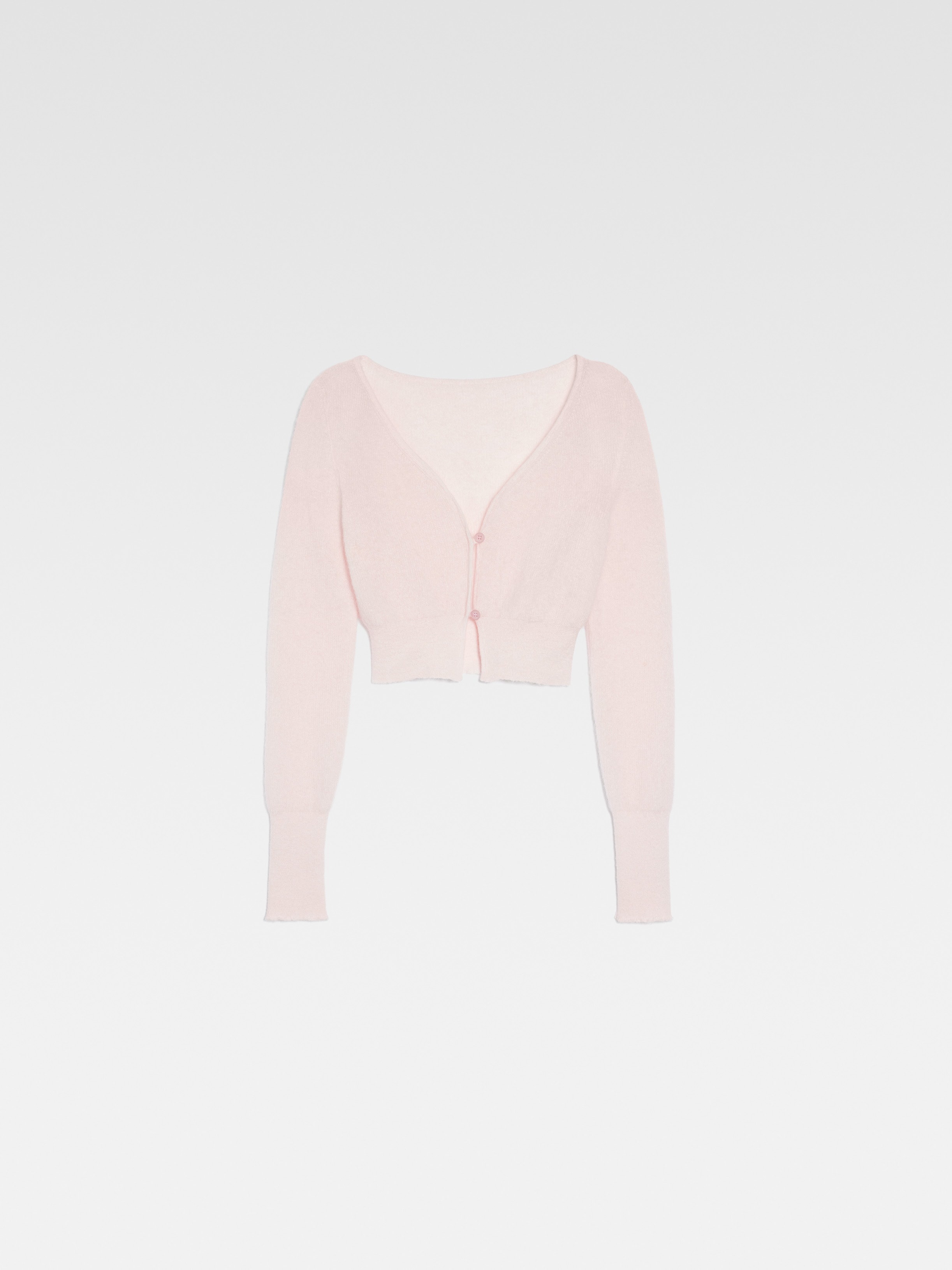 LE CHOUCHOU Cropped mohair cardigan - Fitted shape with long sleeves - Fluffy mohair knit - Plunging neckline - Two button mother-of-pearl button closure - Ribbed collar, cuffs and hem The model is 177 cm and wears a size 34. 50% Mohair - 36% Polyamide/Nylon - 14% Merino Wool Made in Italy Ref.213KN203-2360-410
