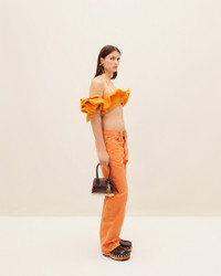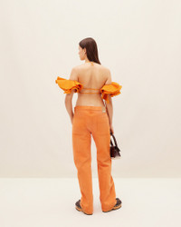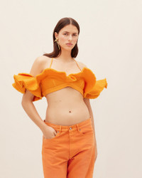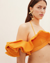 Le Raphia Ruffled bralette - Triangle bra - Topstitched and frayed ruffle on the neckline - Topstitched and frayed ruffled sleeves - Adjustable strap behind the neck - Adjustable straps in the back The model is 177 cm and wears a size 34 100% Cotton Made in Portugal Ref.231TO039-1349-750