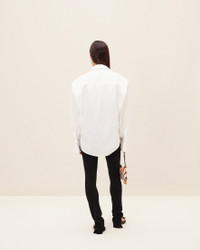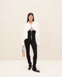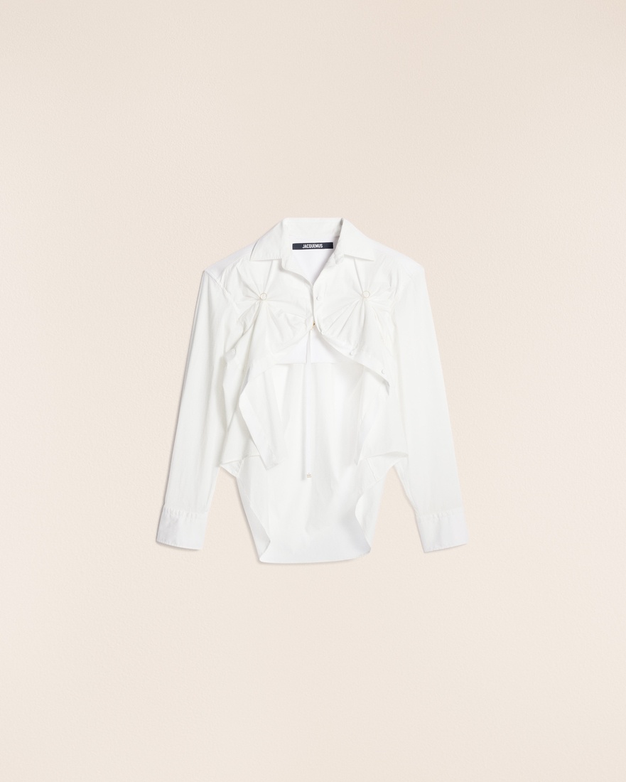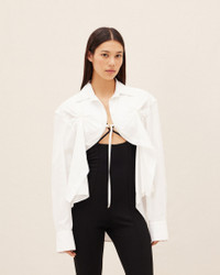 Le Raphia Cropped draped shirt - Short cut with boxy shoulders - Stretch cotton poplin - Pointed collar - Wide long sleeves - Opening maintained by a system of cords and metal D-rings - Draped front - Mother-of-pearl buttons - Interior construction to maintain volume 98% Cotton - 2% Elastane Made in France Ref.231SH025-1326-100