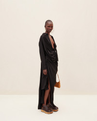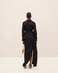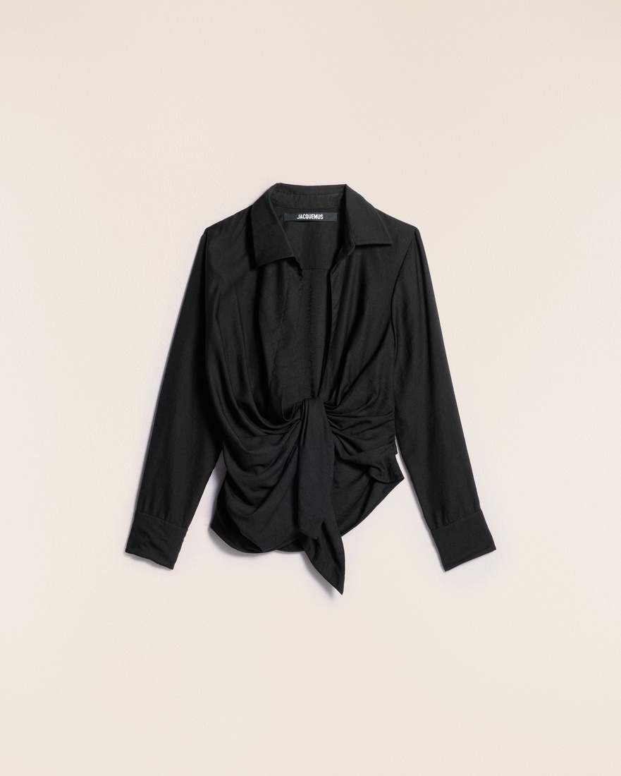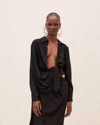 Les Classiques Tied-sash shirt - Twisted, straight fit - Pointed collar - Plunging, draped neckline - Hidden button under the sewn knot - Square cuffs with mother-of-pearl buttons - Asymmetric hem The model is 179 cm and wears a size 34. 88% Viscose - 12% Polyamide/Nylon Made in Portugal Ref. 213SH002-1020-990