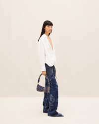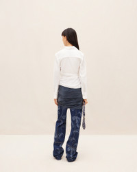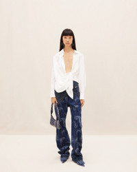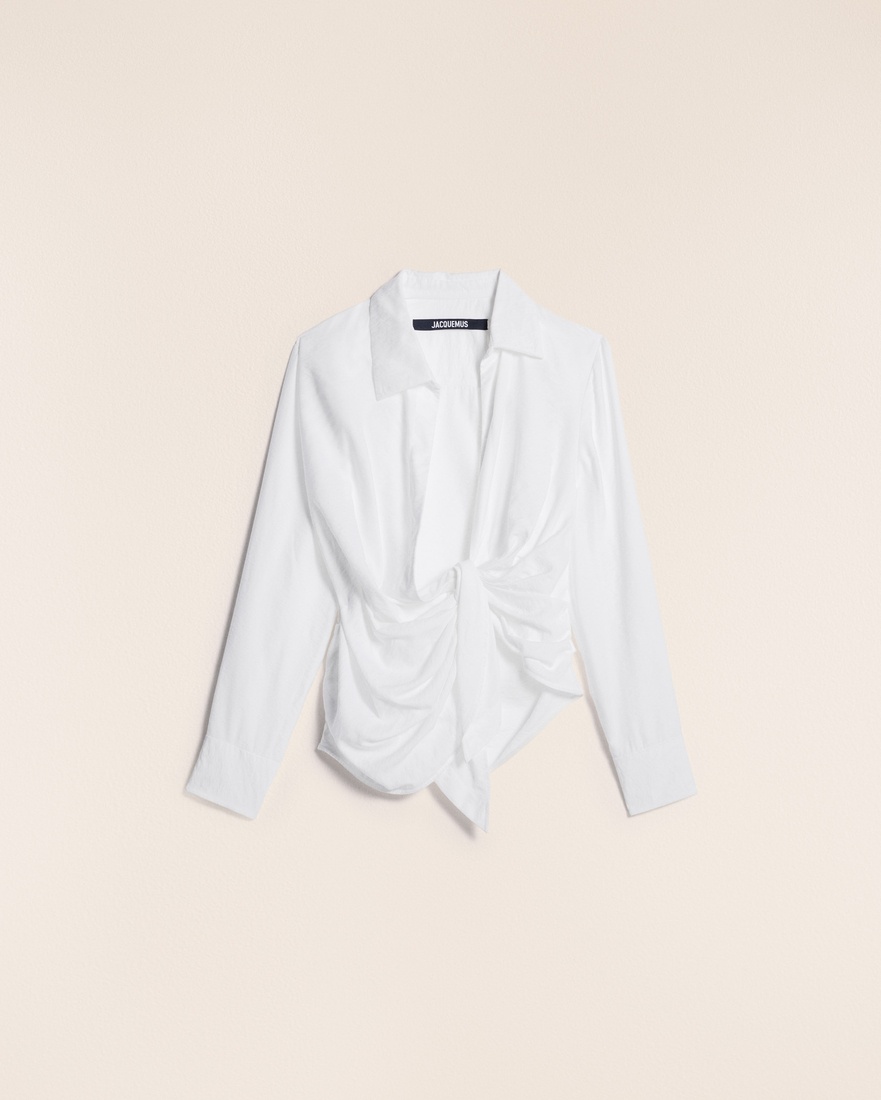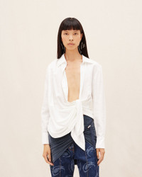 Les Classiques Tied-sash shirt - Twisted, straight fit - Pointed collar - Plunging, draped neckline - Hidden button under the sewn knot - Square cuffs with mother-of-pearl buttons - Asymmetric hem The model is 177 cm and wears a size 34. 88% Viscose - 12% Polyamide/Nylon Made in Portugal Ref. 213SH002-1020-100