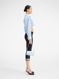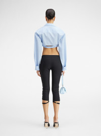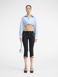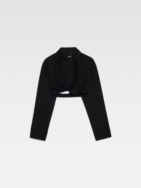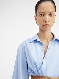 LE CHOUCHOU Twisted shirt - Cropped, loose fit - Pointed collar - Plunging neckline - Buttoned cuffs - Asymmetric draped waistline - Elasticated back strap - Mother-of-pearl buttons The model is 179 cm and wears a size 34. 96% Viscose - 4% Elastane Made in Bulgaria Ref.233SH042-1452-320