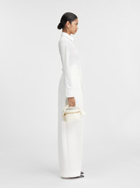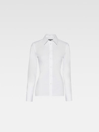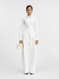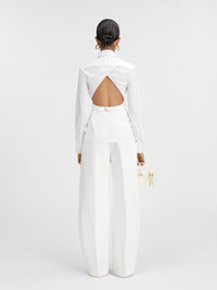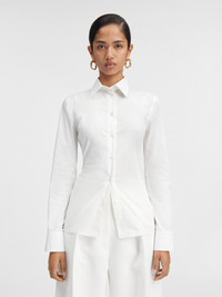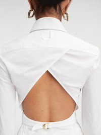 LES SCULPTURES Fitted backless shirt - Fitted shape - Cotton poplin - Pointed collar - Asymmetric “J” shaped chest pocket - Buttoned cuffs - “J” locker loop - Back yoke - Triangular open back - Integrated buckled belt - Metal ring and studs The model is 178 cm and wears a size 34 100% Cotton Made in Bulgaria Ref. 241SH064-1520-100