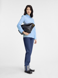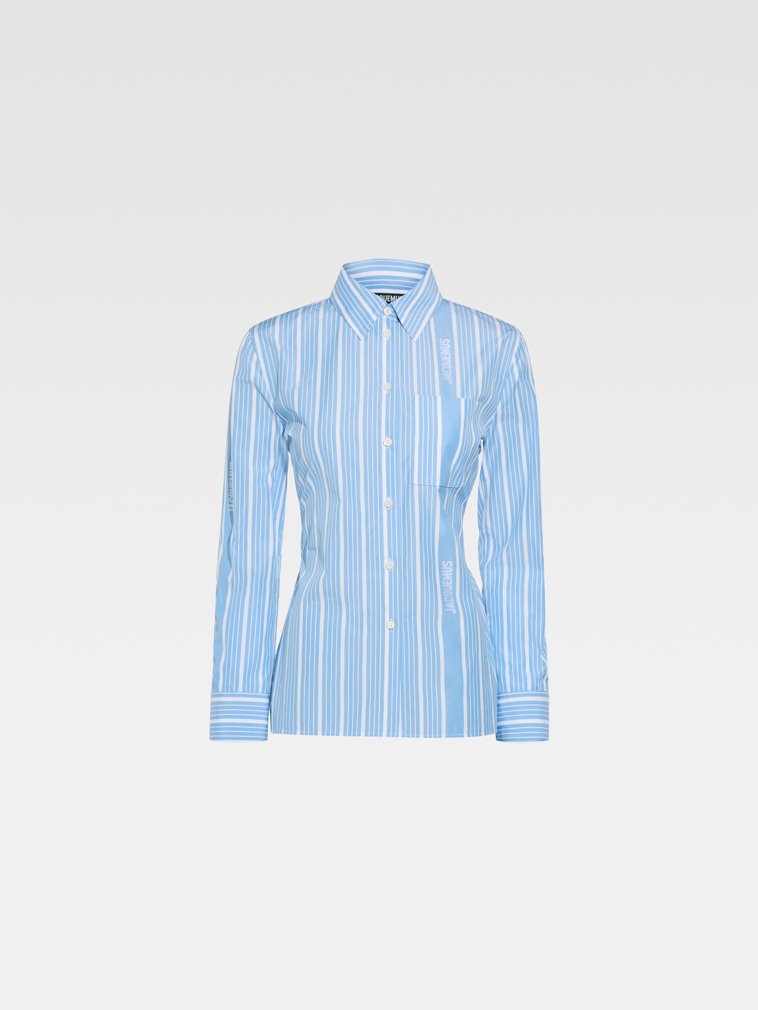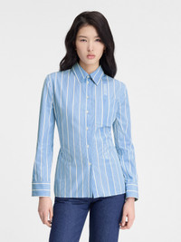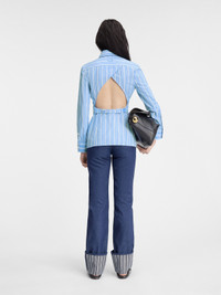 LA CASA Backless striped shirt - Fitted shape - Striped cotton poplin - Jacquard Business logos - Pointed collar - Asymmetric “J” shaped chest pocket - Square, buttoned cuffs - “J” locker loop - Back yoke - Triangular open back - Adjustable belt in the back with metal buckle & studs - Mother-of-pearl buttons The model is 178cm and wears a size 34 100% Cotton Made in Bulgaria Ref. 243SH064-1691-3EV