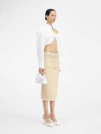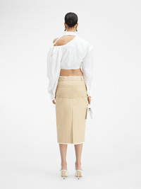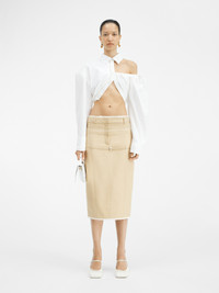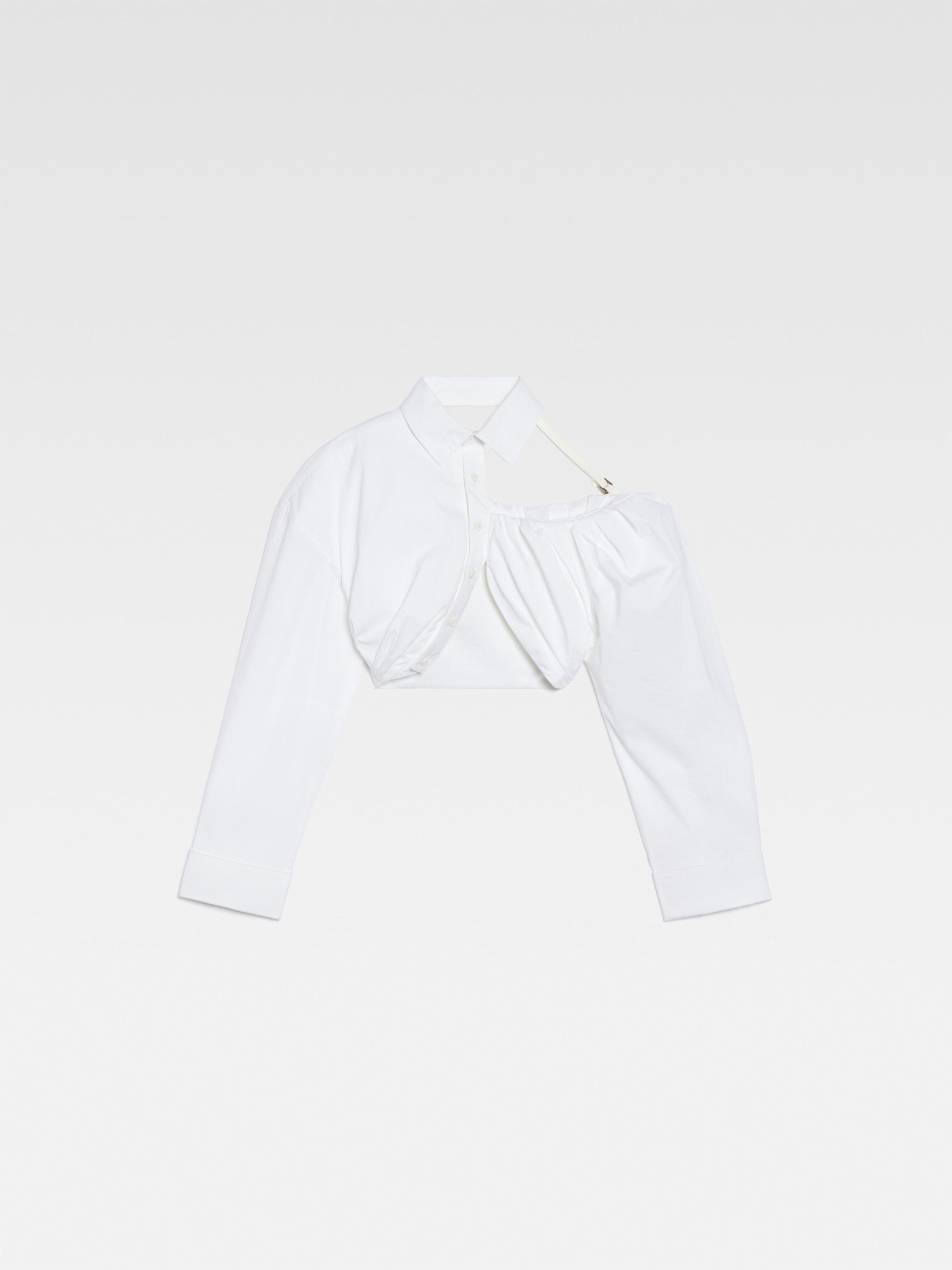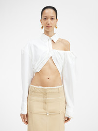 LE CHOUCHOU Asymmetric cropped shirt - Deconstructed shape - Pointed collar - Asymmetric long sleeves - One exposed shoulder with gathered edge and adjustable attached strap - One boxy shoulder with a classic sleeve - Cufflinks - Mother-of-pearl buttons The model is 179 cm and wears a size 34. 96% Viscose - 4% Elastane Made in Bulgaria Ref.233SH037-1454-100