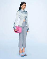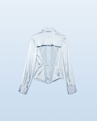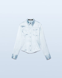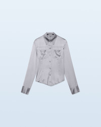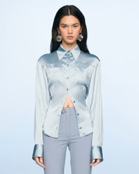 LE SPLASH Satin backless shirt - Fitted shape with an adjustable waist - Satin - Pointed collar - Two patch pockets on the chest - Square button placket and cuffs with mother-of-pearl buttons - Open back beneath the back yoke - Plunging open back with bra fastener This item is made of FSC® -certified fabric. FSC® certification guarantees that materials sourced from forests were managed with consideration for people, wildlife, and the environment. The model is 175 cm and wears a size 34 96% Viscose - 4% Elastane Made in Portugal Ref.221SH012-1000-320