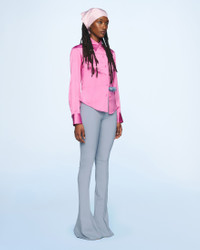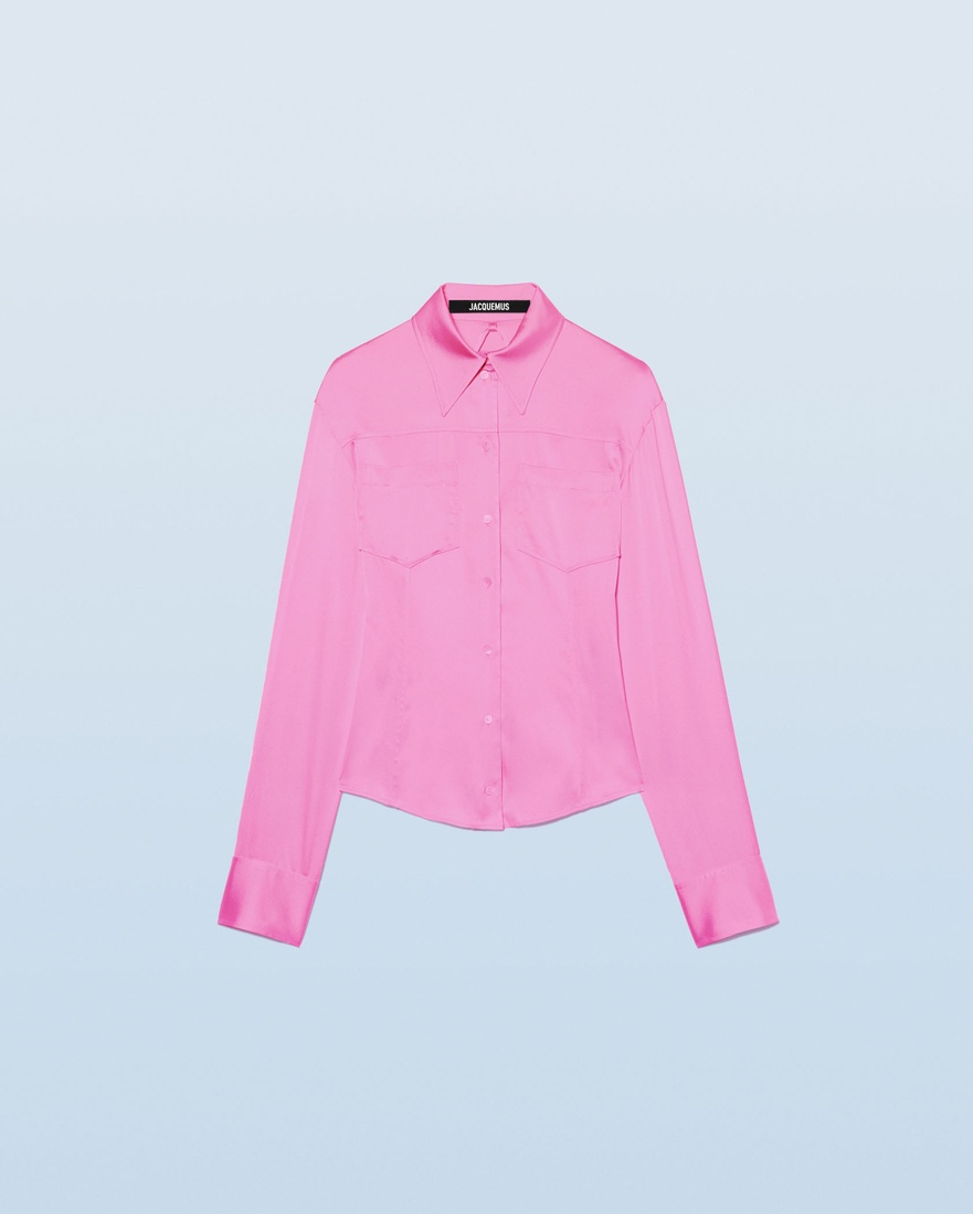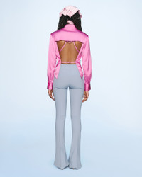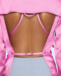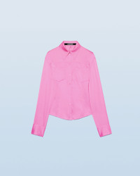 LE SPLASH Satin backless shirt - Fitted shape with an adjustable waist - Satin - Pointed collar - Two patch pockets on the chest - Square button placket and cuffs with mother-of-pearl buttons - Open back beneath the back yoke - Plunging open back with bra fastener This item is made of FSC® -certified fabric. FSC® certification guarantees that materials sourced from forests were managed with consideration for people, wildlife, and the environment. The model is 178 cm and wears a size 34 96% Viscose - 4% Elastane Made in Portugal Ref.221SH012-1000-430