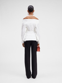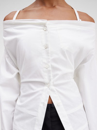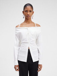 LE CHOUCHOU Off-the-shoulder shirt - Straight fit with adjustable waist - Adjustable metal D-ring halter strap - Chest patch pocket - Adjustable metal D-ring belt in the back - Pleated volume in the back - Cufflinks - Mother-of-pearl buttons The model is 177 cm and wears a size 34. 96% Viscose - 4% Elastane Made in France Ref.233SH038-1454-100
