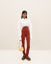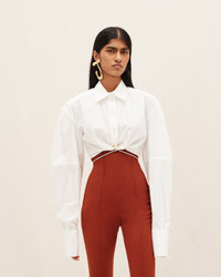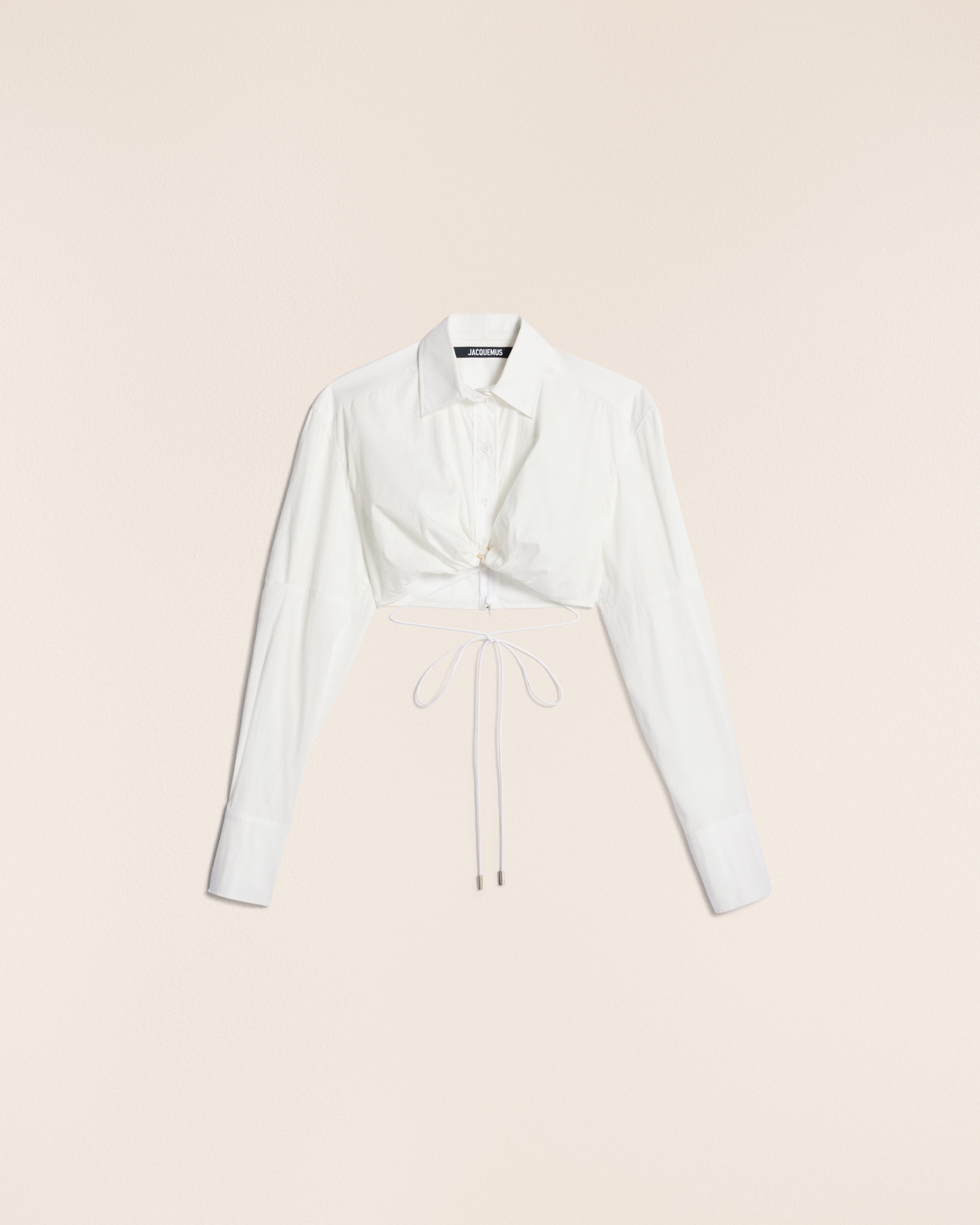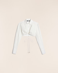 Le Raphia Gathered shirt - Cropped volume with boxy shoulders - Stretch cotton poplin - Classic collar - Extra wide long sleeves - Long square cuffs - Draped hem - Drawstring detail at waist - Hidden zip closure on the back The model is 172 cm and wears a size 34 98% Cotton - 2% Elastane Made in Bulgaria Ref.231SH034-1326-100