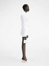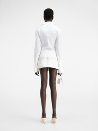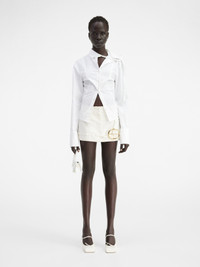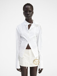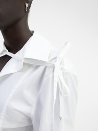 LE CHOUCHOU Hourglass shirt - Boxy fit with fitted waist - Striped cotton - Asymmetric shirt collar - Ribbons woven through the collar - Buttoned cuffs - Mother-of-pearl button The model is 180 cm and wears a size 34. 96% Viscose - 4% Elastane Made in France Ref.233SH045-1454-100