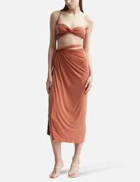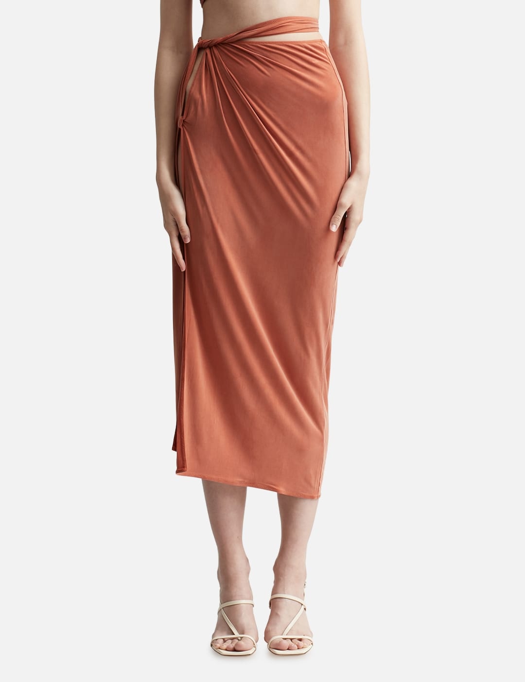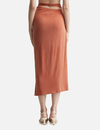 - Jacquemus - La jupe Espelho - Fitted - High waist - Midi length - Asymmetrical design - Split at mid-thigh - Cut-out design with knotted details - Twisted waistband with metal buckle at rear - Color: Red - Material: 93% Cupro, 7% Elastane - See more Skirts and Clothing SIZING - Model wears size S - Model measures: Height 176cm, Chest 32”/81cm, Waist 23”/59cm,Hip 35”/90cm