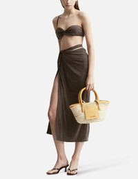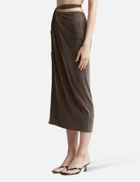 - Jacquemus - La jupe Espelho - Fitted - High waist - Midi length - Asymmetrical design - Split at mid-thigh - Cut-out design with knotted details - Twisted waistband with metal buckle at rear - Color: Brown - Material: 93% Cupro, 7% Elastane - See more Skirts and Clothing SIZING - Model wears size S - Model measures: Height 176cm, Chest 32”/81cm, Waist 23”/59cm,Hip 35”/90cm