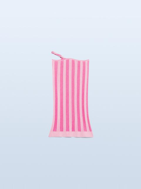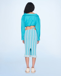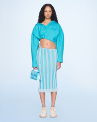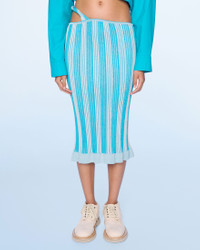 LE SPLASH Striped knit skirt - Tight fit - Plated, striped rib knit - Low waist - Twisted hip strap - Split hem in the back The model is 176 cm and wears a size 34 60% Cotton - 36% Polyamide/Nylon - 4% Elastane Made in Italy Ref.221KN062-2045-030