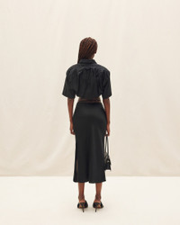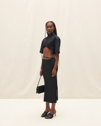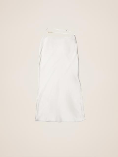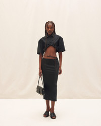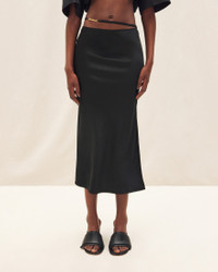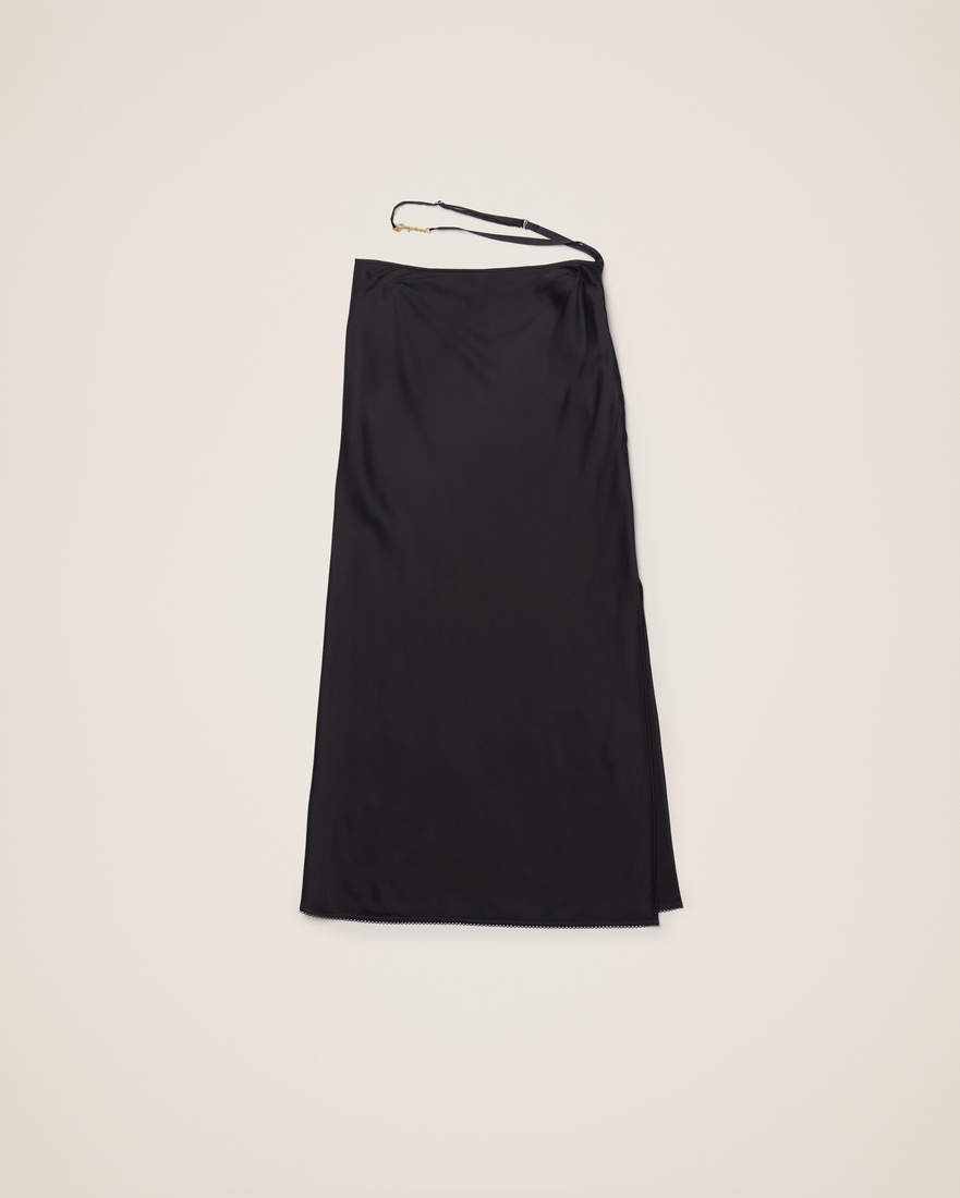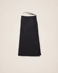 LE PAPIER Satin midi skirt - Straight fit - Midi length - Stretch satin - High waisted with separated lingerie straps - Gold metal charm logo - Long side slit - Hidden zip closure on the side 96% Viscose - 4% Elastane Made in Portugal Ref.213SK009-1000-990