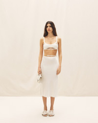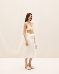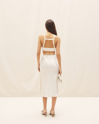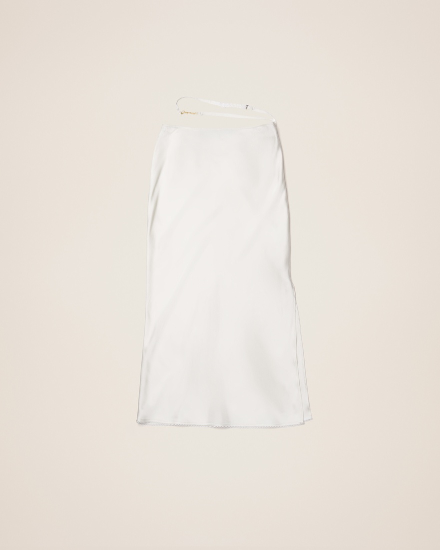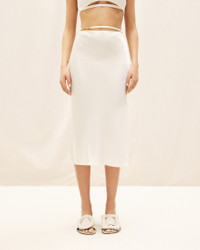 LE PAPIER Satin midi skirt - Straight fit - Midi length - Stretch satin - High waisted with separated lingerie straps - Gold metal charm logo - Long side slit - Hidden zip closure on the side 96% Viscose - 4% Elastane Made in Portugal Ref.213SK009-1000-110