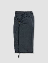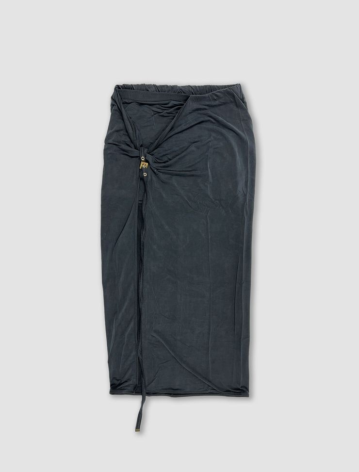 Jacquemus' La jupe pareo Croissant skirt with low-waisted slit. Straight midi fit and asymmetrical gathering at waist. Long side slit and decorative knot with gold metal buckle. Product Reference Code: 233SK044-2307 990