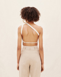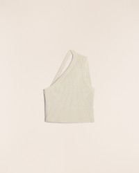 Le Raphia Asymmetric crop top - Short, fitted and asymmetrical shape - Rib knit - Single shoulder strap - Halter top with adjustable straps 86% Linen - 13% Polyamide/Nylon - 1% Elastane Made in Portugal Ref.213KN009-2330-130