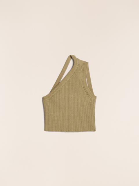 LE SPLASH Asymmetric crop top - Short, fitted and asymmetrical shape - Rib knit - Single shoulder strap - Halter top with adjustable straps The model is 176 cm and wears a size 34 86% Linen - 13% Polyamide/Nylon - 1% Elastane Made in Portugal Ref.213KN009-2330-990