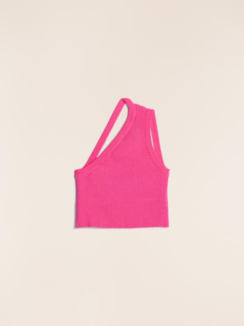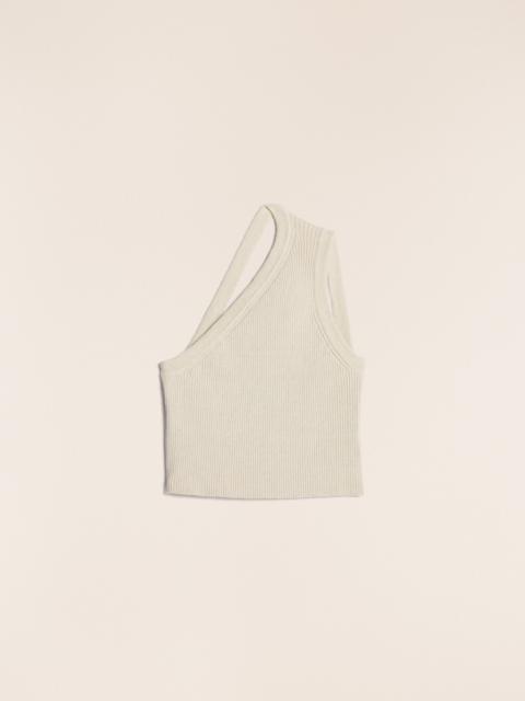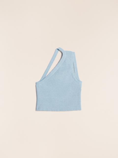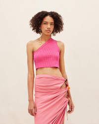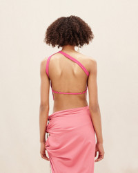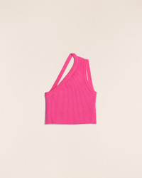 LE SPLASH Asymmetric crop top - Short, fitted and asymmetrical shape - Rib knit - Single shoulder strap - Halter top with adjustable straps The model is 175 cm and wears a size 34 86% Linen - 13% Polyamide/Nylon - 1% Elastane Made in Portugal Ref.213KN009-2330-430